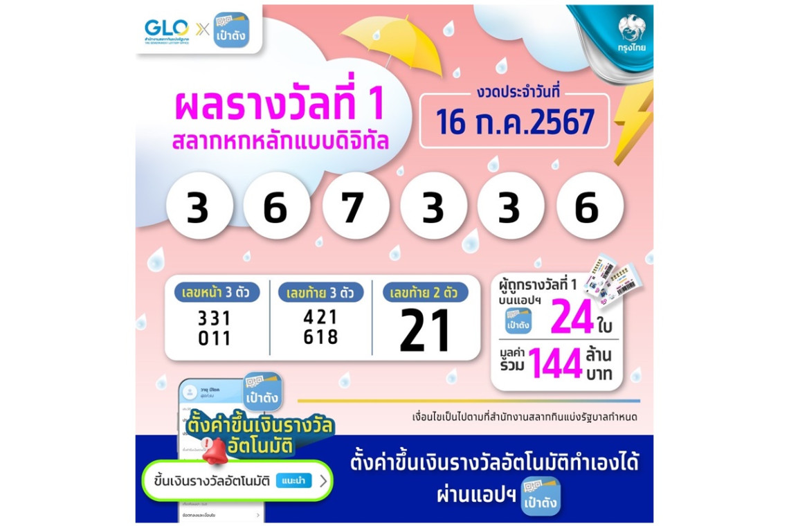 สลากดิจิทัล บนแอปพลิเคชัน เป๋าตัง ของธนาคารกรุงไทย งวดประจำวันที่ 16 ก.ค. 67