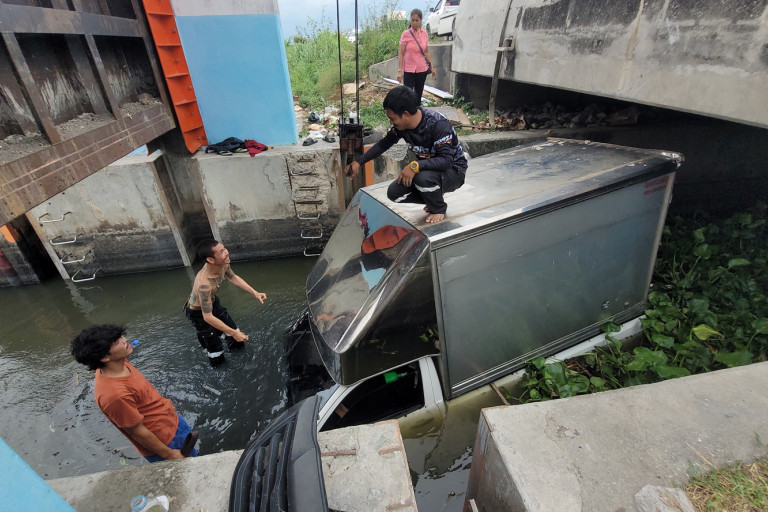 ที่เกิดเหตุพบรถยนต์กระบะตู้ทึบ ยี่ห้อ โตโยต้า วีโก้ สีขาว ทะเบียน 3 ฒษXXXX กรุงเทพมหานคร จมอยู่ในน้ำครึ่งคัน อยู่ระหว่างสะพานและประตูระบายน้ำ สภาพหน้ารถ และด้านข้างตู้ได้รับความเสียหาย ใกล้กันพบ นายธนา อายุ 24 ปี ซึ่งเป็นคนขับรถคันดังกล่าว ได้รับบาดเจ็บเล็กน้อย ที่บนพื้นถนน พบรอยขูดถนน เป็นทางยาวประมาณ 100 เมตร