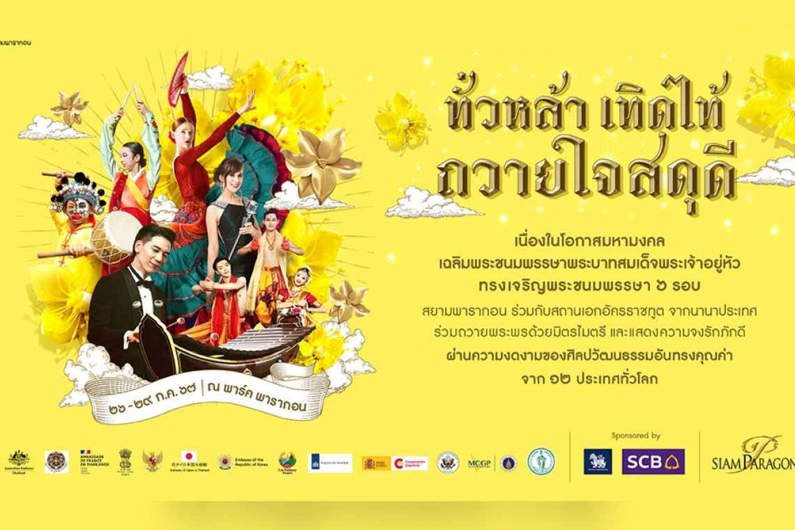 ขอเชิญประชาชนร่วมเฉลิมพระเกียรติและถวายพระพรพระบาทสมเด็จพระเจ้าอยู่หัว พร้อมชมการแสดงสุดพิเศษจากประเทศต่างๆ ได้โดยไม่มีค่าใช้จ่าย ระหว่างวันที่ 26-29 กรกฎาคม 2567 ตั้งแต่เวลา 13.00 -19.00 น. โดยจะมีพิธีเปิดงานในวันที่ 26 กรกฎาคม 2567 เวลา 14.00 น. ซึ่งได้รับเกียรติจากเอกอัครราชทูตพร้อมตัวแทนจากประเทศต่างๆ มาร่วมงาน และชมการแสดงของประเทศไทย นำโดยศิลปินดัง อาทิ ระนาดเอก โดย อาร์ม-กรกันต์ สุทธิโกเศศ และชมการแสดง 4 ภาคที่ออกแบบการแสดงโดย ดร.สุรัตน์ จงดา โดยมีนักแสดงสาวญาดา-นริลญา กุลมงคลเพชร ร่วมแสดงด้วย ณ บริเวณ พาร์ค พารากอน ชั้น M ศูนย์การค้าสยามพารากอน สอบถามรายละเอียดเพิ่มเติม โทร. 02-610-8000 หรือติดตามรายละเพิ่มเติม เฟสบุ๊ค : SIAMPARAGON
