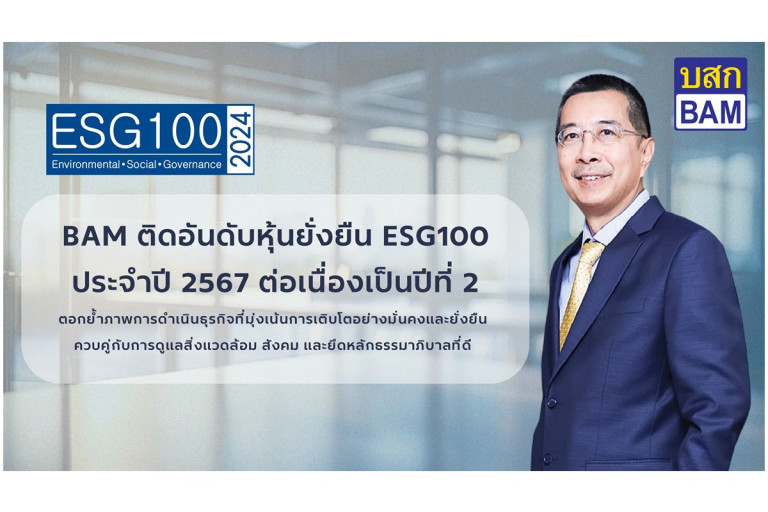 บริษัทบริหารสินทรัพย์ กรุงเทพพาณิชย์ จำกัด (มหาชน) (BAM) ผู้นำธุรกิจบริหารสินทรัพย์ด้อยคุณภาพและทรัพย์สินรอการขาย ได้รับคัดเลือกจากสถาบันไทยพัฒน์ให้อยู่ในรายชื่อ ESG 100 ประจำปี 2567 ต่อเนื่องเป็นปีที่ 2 ด้วยการคัดเลือกจาก 920 หลักทรัพย์จดทะเบียน ให้เป็นบริษัทที่มีการดำเนินงานโดดเด่นด้านสิ่งแวดล้อม สังคม และธรรมาภิบาล (ESG) ตอกย้ำภาพการดำเนินธุรกิจที่มุ่งเน้นการเติบโตอย่างมั่นคงและยั่งยืนตลอดมา