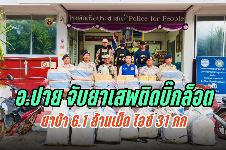 อำเภอปาย จังหวัดแม่ฮ่องสอน บูรณาการหน่วยงานเร่งปราบปรามยาเสพติดตามนโยบายเร่งด่วนของรัฐบาลและมหาดไทย จับกุมยาบ้าได้ถึง 6.1 ล้านเม็ดและยาไอซ์อีก 31 กก.หลังเฝ้าหาข่าวติดตามมากว่า 1 เดือน