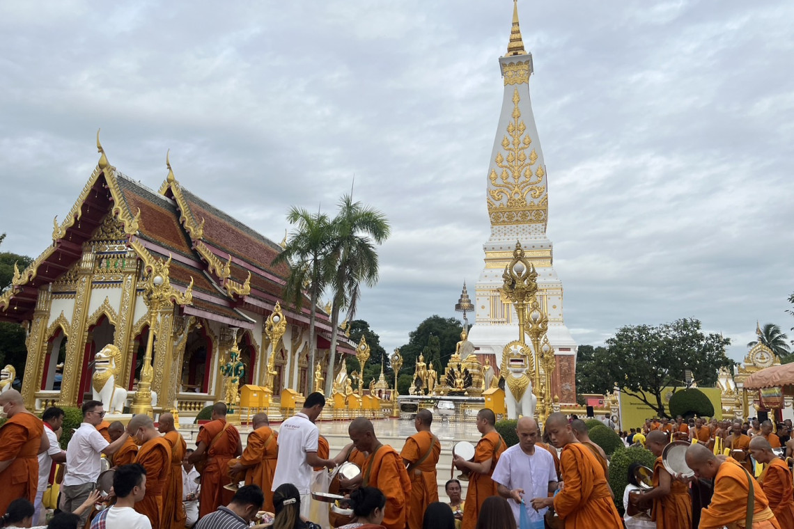 เมื่อวันที่ 20 กรกฎาคม 2567 ที่วัดพระธาตุพนมวรมหาวิหาร อ.ธาตุพนม จ.นครพนม นายจักรพงษ์ ปทุมไกยะ นายอำเภอธาตุพนม เป็นประธาน นำพุทธศาสนิกชน ประชาชน นักท่องเที่ยว ประกอบพิธีทำบุญ เนื่องในวันสำคัญทางพระพุทธศาสนา วันอาสาฬหบูชา พร้อมทำบุญตักบาตร พระสงฆ์ 97 รูป ในโครงการบรรพชาอุปสมบท เฉลิมพระเกียรติพระบาทสมเด็จพระเจ้าอยู่หัว เนื่องในโอกาสพระราชพิธีมหามงคลเฉลิมพระชนมพรรษา 6 รอบ ถวายเป็นพุทธบูชา ต่อองค์พระธาตุพนม อายุเก่าแก่กว่า 2,500 ปี ภายในบรรจุพระอุรังคธาตุ กระดูกส่วนหน้าอก ของพระพุทธเจ้า โดยพระสงฆ์ ทั้ง 97 รูป จะจำวัดบำเพ็ญภาวนา ถวายเป็นพระราชกุศล รวมตลอดระยะเวลา 21 วัน จนถึงวันที่ 3 สิงหาคม 2567