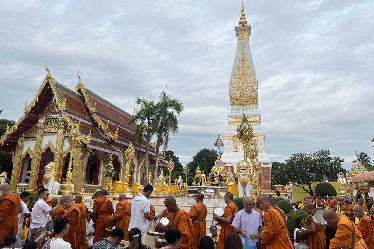 นครพนม พุทธศาสนิกชน ประชาชน นักท่องเที่ยว ร่วมทำบุญวัดพระธาตุพนม ตักบาตร พระสงฆ์ 97 รูป อุปสมบทเฉลิมพระเกียรติในหลวง เนื่องในโอกาสพระราชพิธีมหามงคลเฉลิมพระชนมพรรษา 6 รอ ถวายเป็นพุทธบูชสา วันสำคัญทางศาสนา อาสาฬหบูชา เสมือนได้ทำบุญใกล้ชิด พระพุทธเจ้า