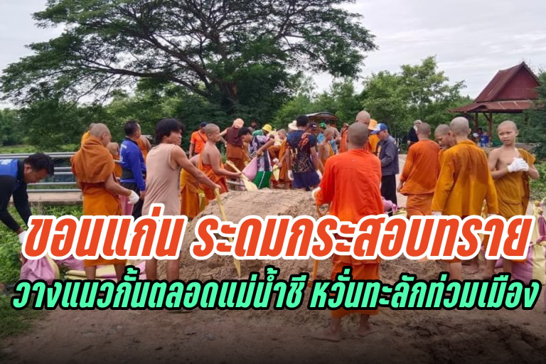 พระขอนแก่น นำชาวชุมชน ร่วมกันบรรจุกระสอบทรายวางแนวกั้นน้ำตลอดแม่น้ำชีหวั่นน้ำไหลทะลักเข้าท่วมพื้นที่ ขณะที่เทศบาลฯปิดประตูระบาย เร่งสูบน้ำออกนอกพื้นที่ ตามแผนการระบายน้ำและรองรับมวลน้ำจากเขตเมืองไหลเข้าพื้นที่ในระยะนี้