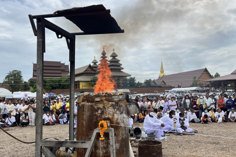 เมื่อเวลา 09.00 น.ของวันที่ 22 กค 67 ประชาชนนับหมื่นจากทั่วทุกสารทิศได้เดินทางมา ณ สถานที่จัดสร้างพระใหญ่ข้างวัดพุทธวนาราม (วัดป่าวังน้ำเย็น)ต.เกิ้ง อ.เมือง มหาสารคาม ทางวัดได้ปิดถนนหน้าวัดให้รถสองแถวรับส่งจากปากทาง เพื่อมาร่วมในพิธีบวงสรวง ประกอบในพิธีเททองหล่อพระเกศ พระนั่งเมืององค์ใหญ่ สูง168 เมตร(หรือเทียบกับตึกสูง 55 ชั้น) โดย พระวชิรญาณวิศิษฏ์ วิ. (สุริยันต์ โฆสปญฺโญ) ผู้ช่วยเจ้าอาวาสวดมหาชัย พระอารามหลวง ประธานสงฆ์ วัดพุทธวนาราม (วัดป่าวังน้ำเย็น) พร้อมด้วย พระครูปลัดอาจริยวัฒน์ (ทรงศักดิ์ นิราลโย) เจ้าอาวาสวัดพุทธวนาราม (วัดป่าวังน้ำเย็น) และทำพิธีมหาพุทธาภิเษกวัตถุมงคลพระปิดตาจินดามณี รุ่น “ปลอดภัย ดวงดี” จำนวน 85000 องค์ พระสงฆ์เจริญชัยมงคลคาถา กล่าวสัมโมทนียกถา พระสงฆ์อนุโมทนา และมีการประมูลพระปิดตา รุ่น “ปลอดภัย ดวงดี” ปิดทองแท้ ฝังกระกุดทองคำฝังชิ้นสมเด็จวัดระฆังหมายเลข 168 มูลค่า 3,999,999 บาท จากนั้นได้ให้ผู้เข้าร่วมพิธีรับฟรี พระปิดตา รุ่น “ปลอดภัย ดวงดี” เป็นอันเสร็จพิธี