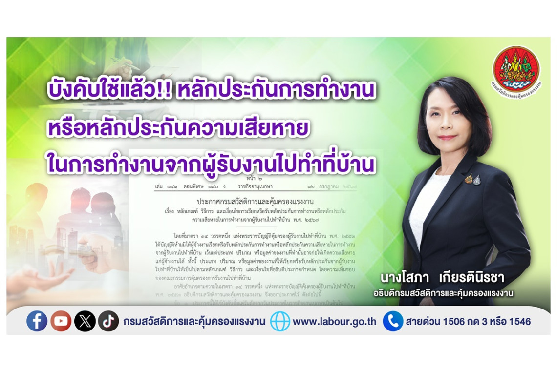 นางโสภา เกียรตินิรชา อธิบดีกรมสวัสดิการและคุ้มครองแรงงาน เปิดเผยว่า รัฐมนตรีว่าการกระทรวงแรงงานมีนโยบายให้พี่น้องผู้ใช้แรงงานได้รับการคุ้มครองแรงงานอย่างเป็นธรรมไม่ว่าจะเป็นแรงงานในระบบหรือนอกระบบต้องได้รับสิทธิประโยชน์ที่พึงจะได้รับอย่างถูกต้องตามกฎหมาย ตลอดระยะเวลาที่ผ่านมากระทรวงแรงงาน โดยกรมสวัสดิการและคุ้มครองแรงงานได้ดำเนินการพัฒนากฎหมายเพื่อคุ้มครองแรงงานนอกระบบในทุกมิติ เพื่อนำไปสู่แรงงานมีคุณภาพชีวิตที่ดี โดยล่าสุด ได้ออกประกาศกรมฯ เรื่อง หลักเกณฑ์ วิธีการ และเงื่อนไขการเรียกหรือรับหลักประกันการทำงาน หรือหลักประกันความเสียหายในการทำงานจากผู้รับงานไปทำที่บ้าน พ.ศ. 2567 ซึ่งได้ประกาศในราชกิจจานุเบกษาแล้ว และมีผลบังคับใช้ตั้งแต่วันที่ 13 กรกฎาคม 2567 โดยประเด็นสำคัญของประกาศฉบับดังกล่าว เพื่อเป็นการกำหนดหลักเกณฑ์หลักประกันความเสียหายในการทำงานจากผู้รับงานไปทำที่บ้าน ตามพระราชบัญญัติคุ้มครองผู้รับงานไปทำที่บ้าน พ.ศ. 2553 เพื่อให้เกิดความคุ้มครองที่ชัดเจนและเป็นธรรมต่อผู้จ้างงานและผู้รับงานไปทำที่บ้าน