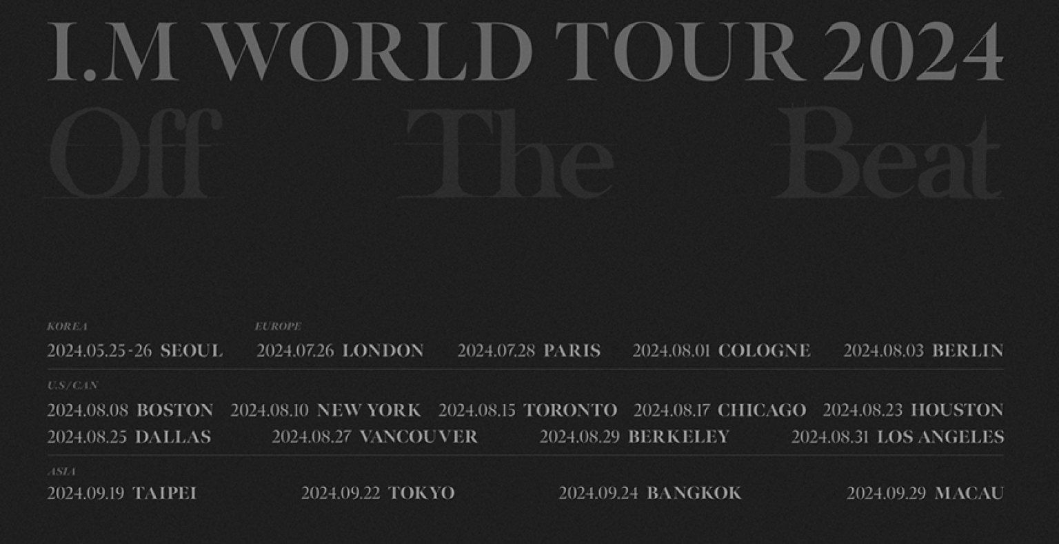 ศิลปินแร็ปเปอร์หนุ่มมากความสามารถจากประเทศเกาหลี “I.M” (ไอเอ็ม) หนึ่งในสมาชิกวง “Monsta X”(มอนสตาเอ็กซ์) หลังจากเริ่มทำกิจกรรมเดี่ยว ล่าสุดเขาได้ปล่อยมินิอัลบั้ม “Off The Beat” และซิงเกิลล่าสุดอย่าง Slowly ก็ฮิตติดชาร์ตระดับโลกอย่าง Billboard มียอดสตรีมทั่วโลกประมาณ 45 ล้านครั้งอีกด้วย ตอนนี้เขาพร้อมแล้วที่จะประกาศเปิดเวิล์ดทัวร์คอนเสิร์ตเดี่ยวครั้งแรกเพื่อออกไปพบกับแฟนๆ กว่า 17 เมืองทั่วโลก ทั้งยุโรป อเมริกาเหนือ และเอเชีย