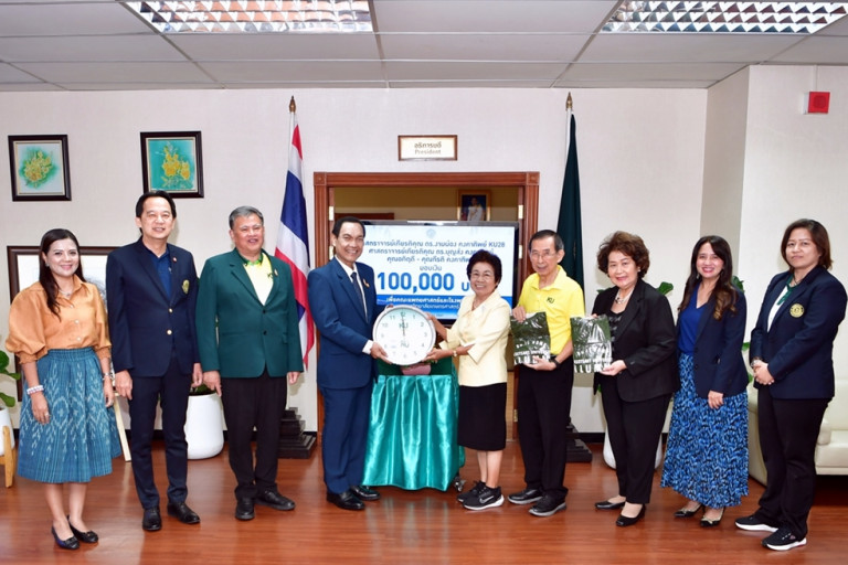 เมื่อวันที่ 25 ก.ค.67 ดร.จงรัก วัชรินทร์รัตน์ อธิการบดีมหาวิทยาลัยเกษตรศาสตร์ รับมอบเงินบริจาคจาก ศ.เกียรติคุณ ดร.งามผ่อง คงคาทิพย์ KU28 ศ.เกียรติคุณ ดร.บุญส่ง คงคาทิพย์ และคุณอภิฤดี - คุณกีรติ คงคาทิพย์ จำนวน 100,000 บาท เพื่อสนับสนุนคณะแพทยศาสตร์และโรงพยาบาลมหาวิทยาลัยเกษตรศาสตร์ โดยมี ดร.ดำรงค์ ศรีพระราม รองอธิการบดีฝ่ายบริหารและความเป็นกลางทางคาร์บอน รศ.ดร.สมหวัง ขันตยานุวงศ์ รองอธิการบดีฝ่ายพัฒนาวิทยาศาสตร์สุขภาพและเขตพื้นที่สุพรรณบุรี ผศ.ดร.นุชนาถ มั่งคั่ง รองอธิการบดีฝ่ายการเงินและบริหารทรัพย์สิน และ ผศ.ดร.จิตต์โสภิณ มีระเกตุ ผู้ช่วยอธิการบดี ร่วมเป็นสักขีพยานณ อาคารสารนิเทศ 50 ปี มหาวิทยาลัยเกษตรศาสตร์