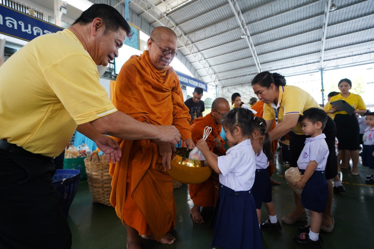 โดยในพิธีดังกล่าว ได้นิมนต์พระครูปลัดสิทธิวัฒน์ หลวงพี่น้ำฝน เจ้าอาวาสวัดไผ่ล้อม จ.นครปฐม พร้อมคณะสงฆ์ 9 รูป บิณฑบาต ข้าวสาร อาหารแห้ง จากคณะครู อาจารย์ เจ้าหน้าที่ นักเรียน ระดับชั้นอนุบาลถึงชั้นประถมศึกษาปีที่ 6 รวมกว่า 2,000 คน ร่วมใจกันตักบาตรเฉลิมพระเกียรติฯ เพื่อแสดงความจงรักภักดีโดยพร้อมเพรียง