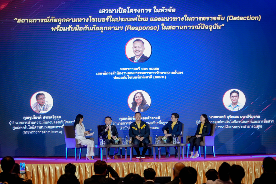 ต่อไปเป็นการเสวนา โดยตัวแทนของ 4 หน่วยงาน ได้แก่ พลอากาศตรี อมร ชมเชย เลขาธิการคณะกรรมการการรักษาความมั่นคงปลอดภัยไซเบอร์แห่งชาติ คุณตติยรัตน์ หอมสำอางค์ ผู้อำนวยการส่วนระบบโครงสร้างพื้นฐานสำนักเทคโนโลยีสารสนเทศ กรมที่ดิน คุณชูเกียรติ ประเสริฐสุข ผู้อำนวยการส่วนความมั่นคงปลอดภัยไซเบอร์ศูนย์เทคโนโลยีสารสนเทศและการสื่อสาร กระทรวงการต่างประเทศ และ นพ.สุรัคเมธ มหาศิริมงคล ผู้อำนวยการศูนย์เทคโนโลยีสารสนเทศและการสื่อสาร สำนักงานปลัดกระทรวงสาธารณสุข ในหัวข้อ “สถานการณ์ภัยคุกคามทางไซเบอร์ในประเทศไทย และแนวทางในการตรวจจับ (Detection) พร้อมรับมือกับภัยคุกคามฯ (Response) กับสถานการณ์ในปัจจุบัน” โดยกล่าวถึงภัยคุกคามทางไซเบอร์ที่แต่ละหน่วยงานเคยประสบ และภารกิจของ สกมช. ตาม พรบ. การรักษาความมั่นคงไซเบอร์ พ.ศ.2562