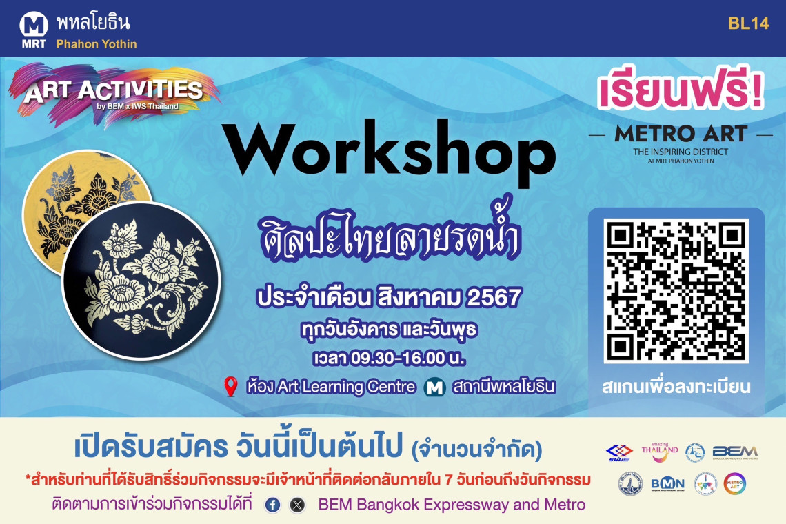 โดยกิจกรรมนี้จะถูกจัดขึ้นทุกวันอังคารและวันพุธตลอดเดือนสิงหาคม ตั้งแต่เวลา 09.30 – 16.00 น.ณ ห้อง Art Learning Centre ที่ Metro Mall ชั้นร้านค้า รถไฟฟ้า MRT สถานีพหลโยธิน ผู้สนใจสามารถสมัครเข้าร่วมกิจกรรมล่วงหน้าได้ฟรี !! ตั้งแต่วันนี้เป็นต้นไป (รับจำนวนจำกัด) ผ่านทาง QR Code หรือ https://citly.me/3NuID