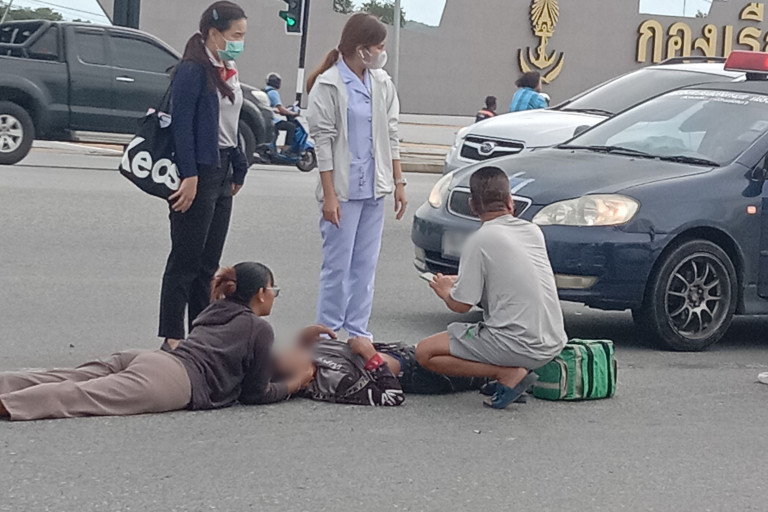 เมื่อ 26 ก.ค.67 เวลา 17.20 น. ได้เกิดอุบัติเหตุ รถจักรยานยนต์ ล้มบนถนนสุขุมวิท แยกไฟแดง ทางเข้ากองเรือยุทธการ อ.สัตหีบ จ.ชลบุรี ตรวจสอบพบผู้บาดเจ็บ เป็นชาวเมียนมา 2 ราย เป็นเพศชาย 1 ราย มีอาการเจ็บบริเวณ สะโพก และแผลถลอก ที่ ขาข้างซ้าย รายที่ 2 เป็นเพศหญิง มีอาการ ปวดศีรษะ เนื่องจากไม่สรวมใส่หมวกกันน๊อคศีรษะกระแทกกับพื้นถนน ไม่มีบาดแผล โดย นาวาตรี ณัฐวัฒน์ เทศนา ตำแหน่ง หัวหน้าแผนกปฏิบัติการสายแพทย์ กองนาวิกเวชกิจ โรงพยาบาลอาภากรเกียรติวงศ์ ฐานทัพเรือสัตหีบ เป็นผู้พบเห็นเหตุการณ์ และให้การช่วยเหลือในเบื้องต้น และให้ข้อมูลผู้บาดเจ็บกับทีมกู้ภัยฯ เพื่อให้การช่วยเหลือต่อและนำส่ง โรงพยาบาลสัตหีบ กม.10 อย่างปลอดภัย