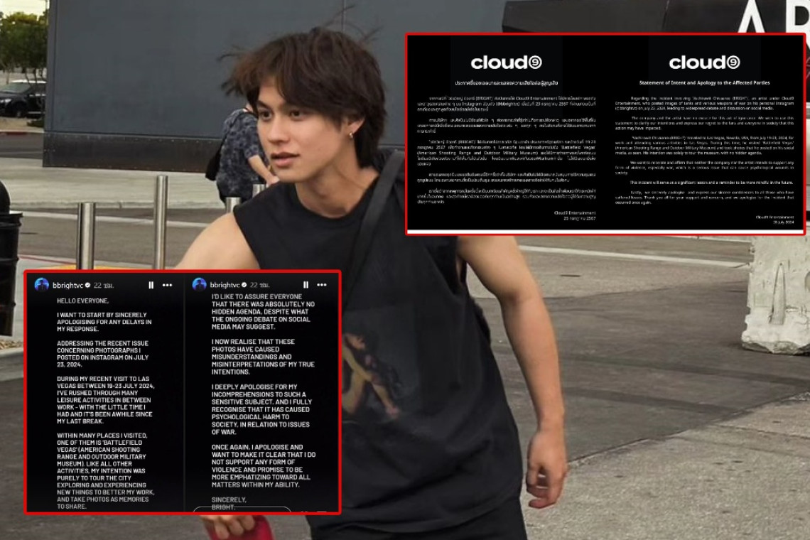 จากกรณีที่ ‘วชิรวิชญ์ ชีวอารี (BRIGHT)’ ศิลปินภายใต้ Cloud9 Entertainment ได้มีการโพสต์ภาพรถถัง และอาวุธสงครามต่างๆ บน Instagram ส่วนตัว (@bbrightvc) เมื่อวันที่ 23 กรกฎาคม 2567 ที่ผ่านมาจนเป็นที่ถกเถียงและถูกพูดถึงบนโซเชียลมีเดียในขณะนี้
