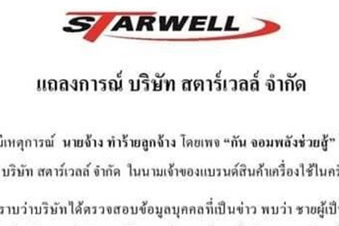 ล่าสุด เมื่อวันที่ 28 ก.ค.67 บริษัท สตาร์เวลล์ จำกัด ซึ่งเป็นบริษัทต้นสังกัด ที่ 2 สามีภรรยา ซึ่งเป็นผู้ก่อเหตุ เป็นตัวแทนจำหน่ายสินค้าเครื่องครัว ได้ออกหนังสือแถลงการณ์ โดยมีเนื้อหาว่า “สืบเนื่องจากมีเหตุการณ์ นายจ้างทำร้ายลูกจ้าง โดยเพจ “กัน จอมพลังช่วยสู้” ได้เข้าช่วยเหลือลูกจ้าง จากเหตุการณ์ดังกล่าว บริษัท สตาร์เวลล์ จำกัด ในนามเจ้าของแบรนด์สินค้าเครื่องใช้ในครัวเรือน “สตาร์เวลล์” ขอเรียนให้ทราบว่า บริษัทได้ตรวจสอบข้อมูลบุคคลที่เป็นข่าว พบว่า ชายผู้เป็นนายจ้าง เป็นตัวแทนจำหน่ายอิสระ จำหน่ายสินค้าของบริษัทภายใต้แบรนด์ “สตาร์เวลล์” โดยบุคคลดังกล่าว ไม่ได้เป็นพนักงานบริษัทแต่อย่างใด เกี่ยวข้องเพียงเป็นตัวแทนจำหน่ายอิสระ ที่นำสินค้าไปจำหน่ายต่อในรูปแบบบริษัทของตนเอง และจ้างพนักงานเพื่อทำทีมขายของตนเอง