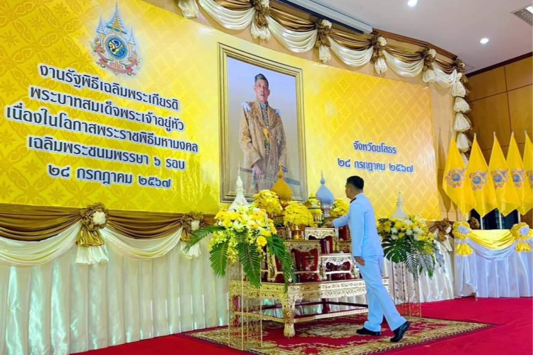 วันที่ 28 ก.ค.67 เวลา 07.00 น. ที่หอประชุมจังหวัดยโสธร ศาลากลางจังหวัดยโสธร นายสุวัฒน์ เข็มเพชรรองผู้ว่าราชการจังหวัดยโสธร พร้อมด้วย ศาล ทหาร ตำรวจ หัวหน้าส่วนราชการ เหล่ากาชาดจังหวัดยโสธร ชมรมแม่บ้านมหาดไทยจังหวัดยโสธร ภาคเอกชน คณะครู นักเรียน นักศึกษา และประชาชน ร่วมพิธีเจริญพระพุทธมนต์และทำบุญตักบาตรพระสงฆ์ 73 รูป ถวายพระราชกุศลพระบาทสมเด็จพระเจ้าอยู่หัว เนื่องในโอกาสพระราชพิธีมหามงคลเฉลิมพระชนมพรรษา 6 รอบ 28 กรกฎาคม 2567