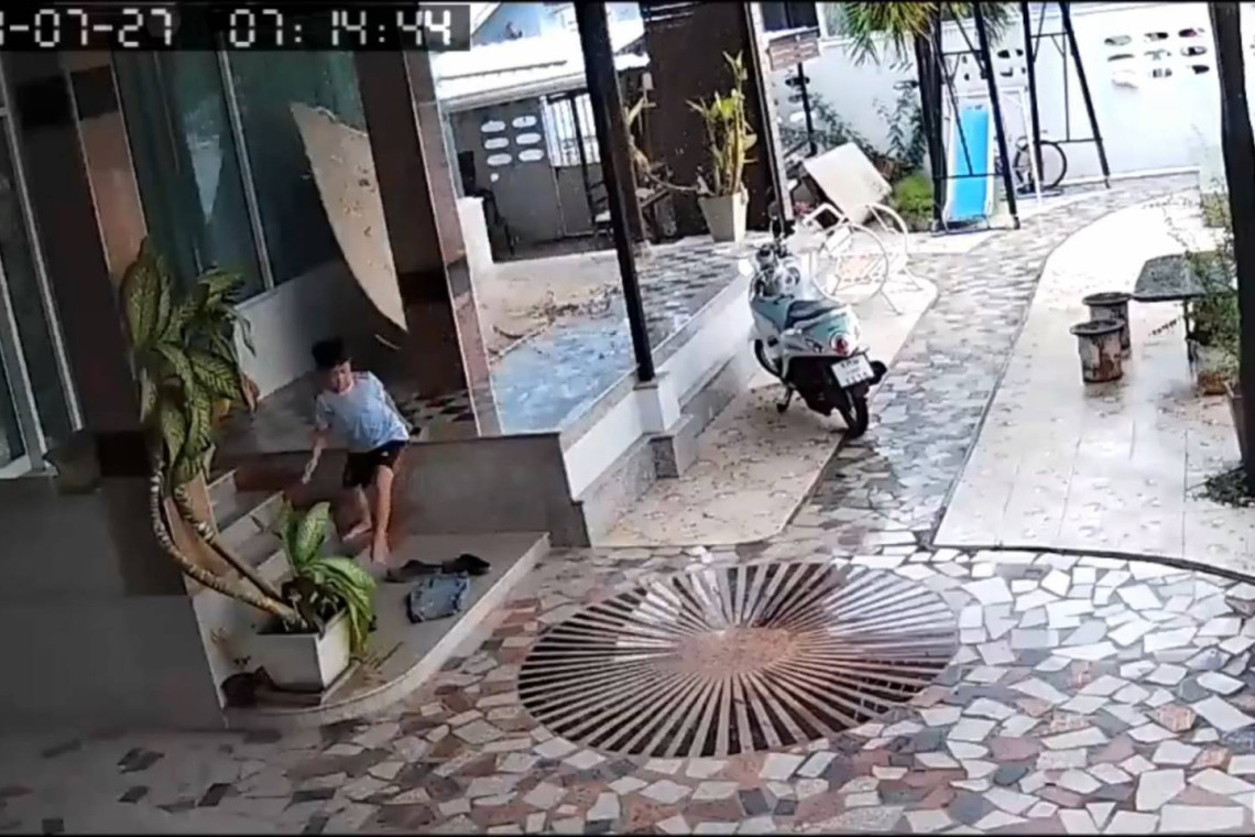 ภาพจากกล้องวงจรปิดที่ติดตั้งไว้ ใต้หลังคาหน้าบ้านเลขที่ 212 หมู่ 10 ตำบลดอนตะโก อำเภอเมือง จังหวัดราชบุรั ที่บันทึกภาพขณะฝ้าเพดานตรงหน้าบ้านพังถล่มลงมา เหตุเกิดช่วงเช้าของวันที่ 27 กรกฎาคม ที่ผ่านมา