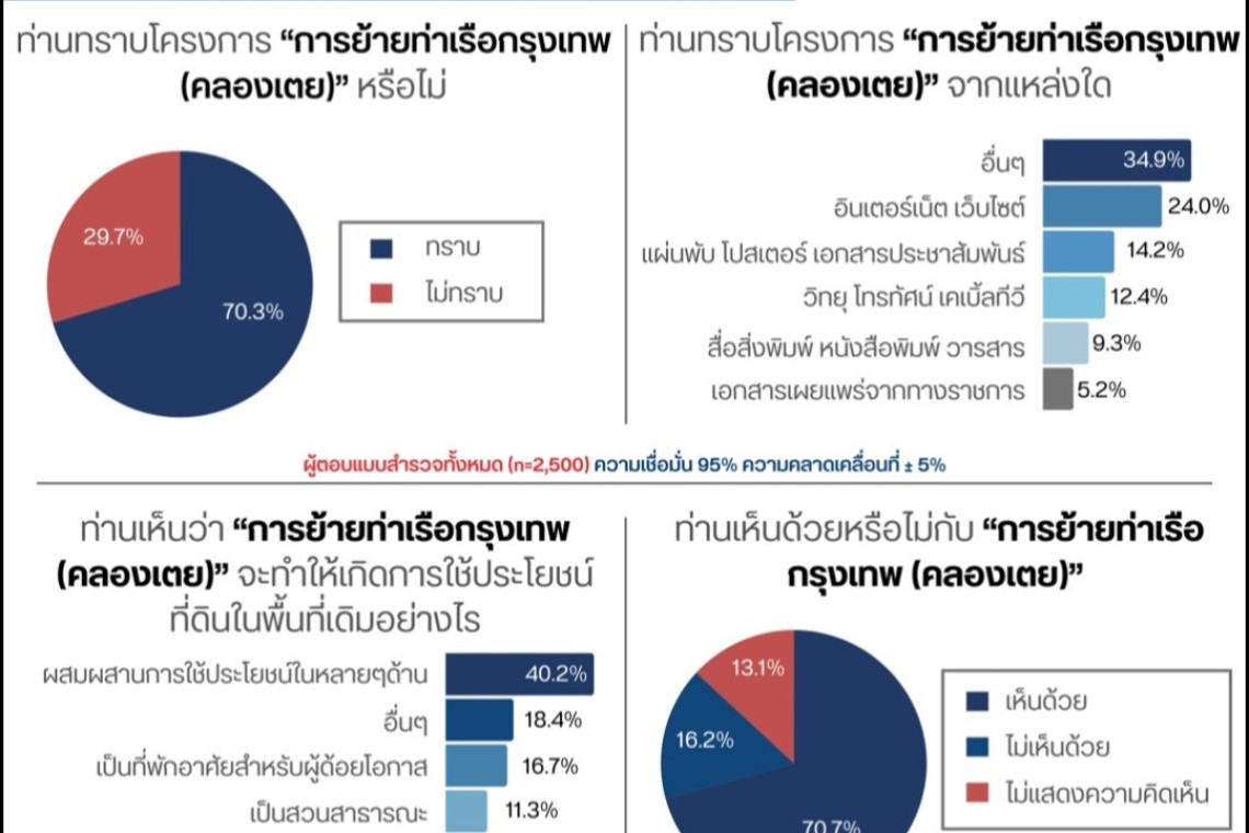 ทั้งนี้ ทาง นอร์ดกรุงเทพโพล ได้ทำการสำรวจประชาชน จำนวน 2,500 ราย เมื่อวันที่ 22-30 ก.ค.67 ที่ผ่านมา โดยสอบถามว่า ท่านทราบโครงการ การย้ายท่าเรือกรุงเทพ(คลองเตย) หรือไม่ พบว่า ประชาชนทราบ 70.3% และไม่ทราบ 29.7% พร้อมทั้วถามต่อว่า เห็นด้วยหรือไม่ กับการย้ายท่าเรือกรุงเทพ(คลองเตย) พบว่า เห็นด้วย 70.7% ไม่เห็นด้วย 16.2% และไม่แสดงความคิดเห็น 13.1%
