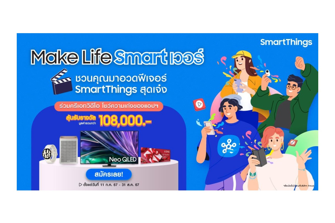 เตรียมตัวให้พร้อม! ซัมซุงเชิญชวนทุกคนมาร่วมกิจกรรมสุดสร้างสรรค์ ในโครงการครีเอทวิดีโอคอนเทนต์ SmartThings “Make Life Smart เวอร์” พื้นที่ที่เปิดโอกาสให้ผู้เข้าร่วมโครงการได้โชว์ความเจ๋งและความคิดสร้างสรรค์อย่างเต็มที่! อวดฟีเจอร์ SmartThings สุดเจ๋ง ว่าชีวิตของคุณสมาร์ทขึ้นได้ด้วยแอปฯ SmartThings และสินค้าของซัมซุงอย่างไร?