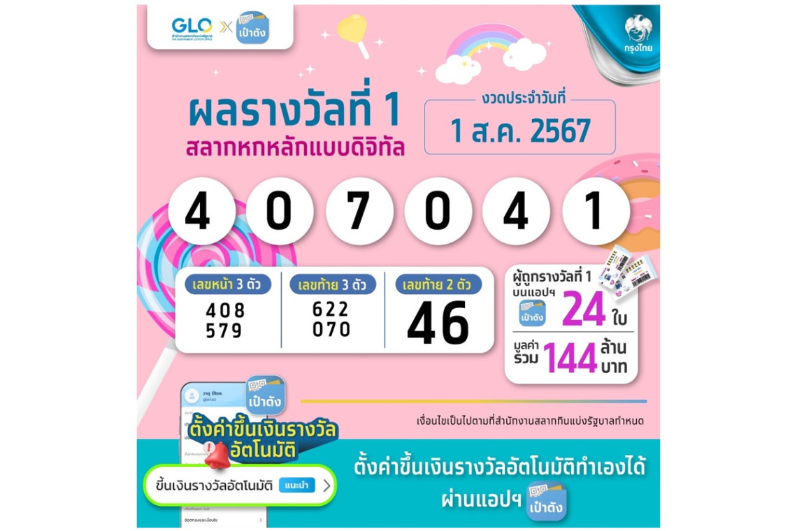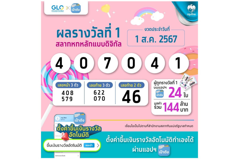 สลากดิจิทัล บนแอปฯ เป๋าตัง ของธนาคารกรุงไทย งวดประจำวันที่ 01 ส.ค.67