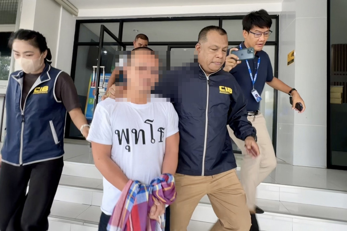 นายปรเมษฐ์ ถูกใส่กุญแจมือสองข้างใช้ผ้าขาวม้าบังไว้ สวมเสื้อคอกลมสีขาว หน้าอกสกรีนคำว่า“พุทโธ”