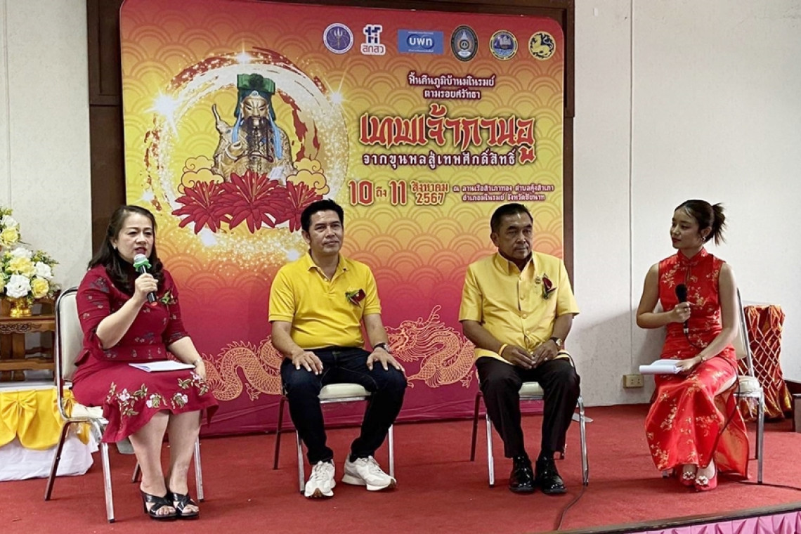 วันที่ 2 ส.ค.67 ผู้สื่อข่าวรายงานว่า ที่ห้องประชุมอำเภอมโนรมย์ จังหวัดชัยนาท ผู้ช่วยศาสตราจารย์ ดร.ฐิตาภา บำรุงศิลป์ ประธานหลักสูตรสาขาวิชาอุตสาหกรรมท่องเที่ยว ผู้แทน มหาวิทยาลัยราชภัฏจันทรเกษม พร้อมด้วย นายบุญญาฤทธิ์ เยี่ยมยอด นายอำเภอมโนรมย์ และนายชาตรี คาล สกุลสุริยะ นายกเทศมนตรีตำบลคุ้งสำเภา ร่วมแถลงข่าวการจัดงานเทศกาลฟื้นคืนภูมิบ้านมโนรมย์ ที่กำหนดจัดขึ้นระหว่าง วันที่ 10-11 สิงหาคม 2567 ณ บริเวณหน้าศาลเจ้าพ่อกวนอู ตำบลคุ้งสำเภา อำเภอมโนรมย์ จังหวัดชัยนาท
