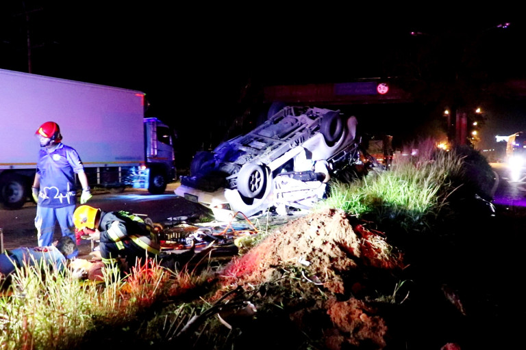 ตำรวจยศ ส.ต.อ.ขับกระบะชนกับรถรั้วขนผักสะตอและใบเหลียงตกเกลื่อน บนถนนเพชรเกษมพื้นที่จังหวัดชุมพรทำให้รถเสียหลักชนอัดตอหม้อเสาไฟส่องสว่างอยู่ในรถหงายท้องล้อชี้ฟ้าบาดเจ็บสาหัส 2 ราย