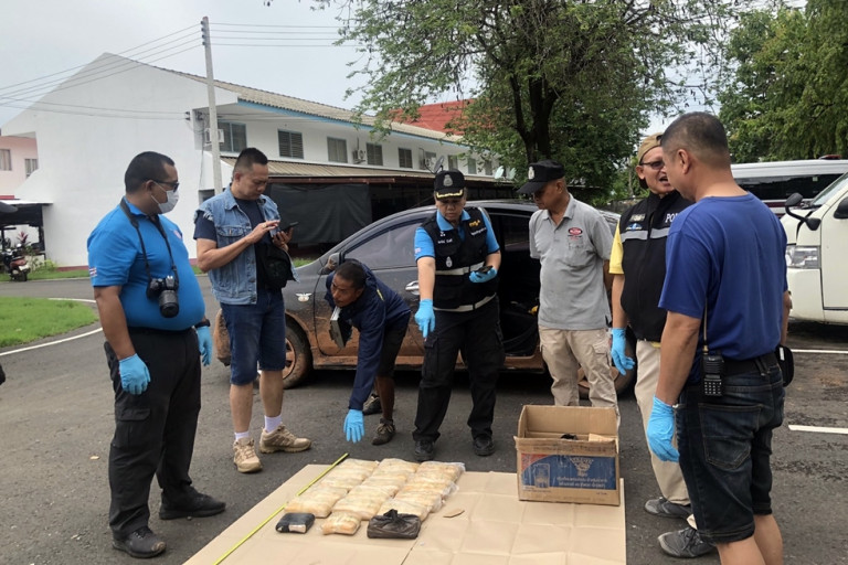 ในที่เกิดเหตุพบรถยนต์เก๋งสีดำ ประสบอุบัติเหตุตกลงข้างถนนสาธารณะบ้านเหล่าสร้างถ่อ ข้าง รร.บ้านเหล่าสร้างถ่อ เป็นรถยนต์เก๋งสีดำ ยี่ห้อ Nissan ทะเบียนสุราษฎร์ธานี เสียหลักตกลงข้างทาง จึงทำการตรวจสอบภายในรถยนต์คันดังกล่าว ไม่พบผู้ขับขี่ ซึ่งภายในรถคันดังกล่าวพบกล่องกระดาษสี่เหลี่ยมสีน้ำตาล จำนวน 1 กล่อง เมื่อทำการตรวจสอบภายในกล่องกระดาษพบมีถุงพลาสติกสีดำ เจ้าหน้าที่ตำรวจจึงได้เปิดถุงดำพบเป็นยาเสพติดให้โทษ ประเภท 1 (ยาบ้า) จำนวน 104,000 เม็ด แต่ไม่พบผู้ขับรถคันดังกล่าว จึงได้แจ้งหน่วยพิสูจน์หลักฐานภูธรจังหวัดมุกดาหารออกตรวจสอบสถานที่เกิดเหตุ หลังจากนั้นได้ส่งของกลางทั้งหมดมาเก็บไว้ที่ สภ.คำชะอี เพื่อขยายผลหาผู้กระทำความผิดมาดำเนินคดีตามกฎหมายต่อไป