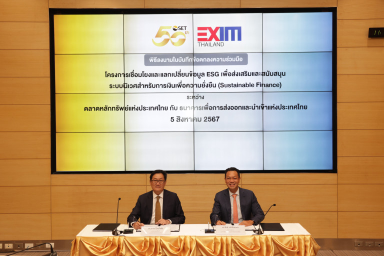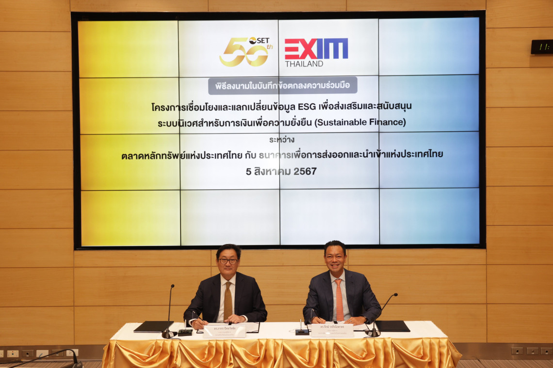 ตลาดหลักทรัพย์แห่งประเทศไทยมุ่งพัฒนาทุกภาคส่วนให้เติบโตไปพร้อมกันอย่างยั่งยืน โดยมีการลงนามในบันทึกข้อตกลงความร่วมมือกับธนาคารเพื่อการส่งออกและนำเข้าแห่งประเทศไทย (EXIM BANK) ภายใต้โครงการเชื่อมโยงและแลกเปลี่ยนข้อมูล ESG เพื่อส่งเสริมและสนับสนุนระบบนิเวศสำหรับการเงินเพื่อความยั่งยืน (Sustainable Finance) รวมถึงข้อมูลการดำเนินงานด้านความยั่งยืนของบริษัทจดทะเบียน (บจ.) ผ่านระบบ ESG Data Platform และสนับสนุนระบบ SET Carbon สำหรับลูกค้าของธนาคารให้มีการดำเนินงานตามเป้าหมายความยั่งยืน โดยตลาดหลักทรัพย์ฯ และ EXIM BANK จะร่วมกันพัฒนาสินเชื่อจากการใช้ข้อมูลด้าน ESG ประกอบการพิจารณา ตั้งแต่ไตรมาสที่ 3 ปี 2567 และเริ่มให้บริการในปี 2568