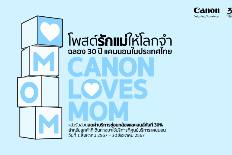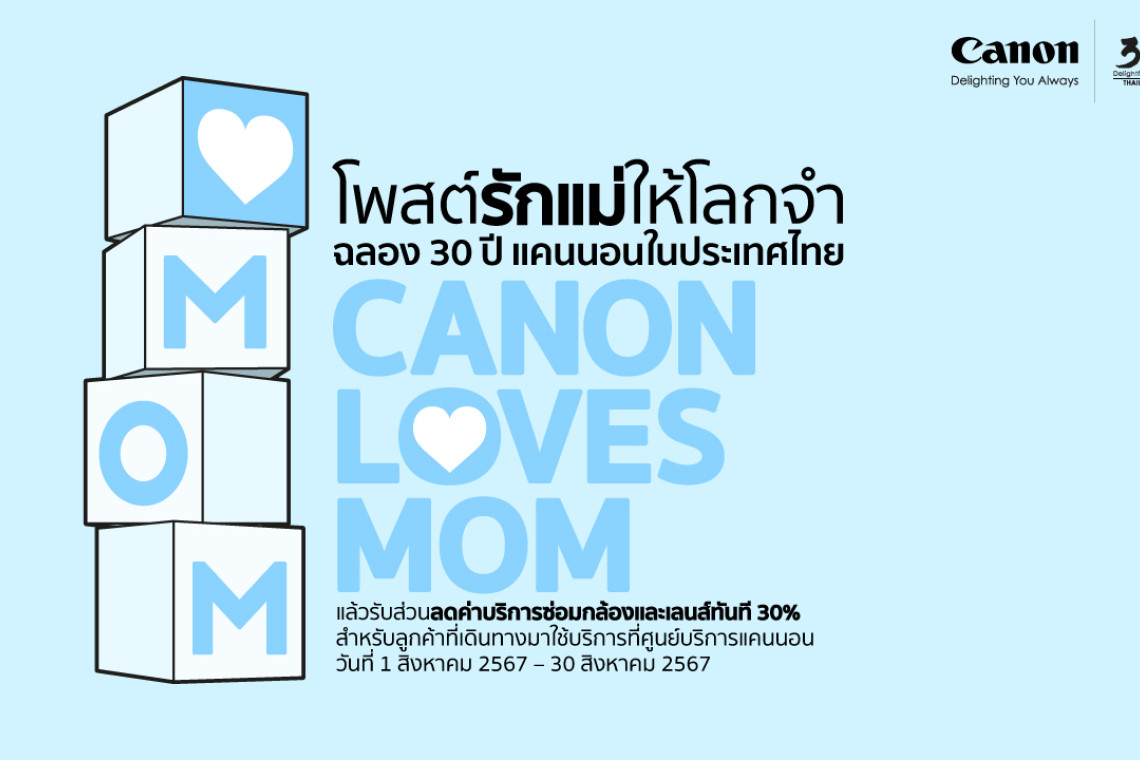 บริษัท แคนนอน มาร์เก็ตติ้ง (ไทยแลนด์) จำกัด ฉลองครบรอบ 30 ปี เชิญชวนลูกค้าร่วมกิจกรรมดี ๆ เนื่องในโอกาสวันแม่ตลอดเดือนสิงหาคม กับโปรโมชัน “Canon Loves Mom - โพสต์รักแม่ให้โลกจำ ฉลอง 30 ปี แคนนอน ไทยแลนด์” มอบส่วนลดค่าบริการ 30% สำหรับบริการซ่อมสินค้าที่ศูนย์บริการแคนนอน (สามารถใช้ร่วมกับส่วนลดประกันศูนย์ได้ โดยลดเพิ่มอีก 30% จากค่าบริการ หลังหักส่วนลดสินค้าประกันศูนย์) เพียงโพสต์ข้อความรักแม่ในแบบของคุณ สามารถร่วมกิจกรรมได้ทั้งแบบ Onsite ณ ศูนย์บริการแคนนอน สำนักงานใหญ่ อาคารสารทรสแควร์ ทาวเวอร์ ชั้น 24 ในเวลาทำการ 08:15 – 17:15 น. (วันจันทร์ – ศุกร์ ยกเว้นวันเสาร์ - อาทิตย์และวันหยุดนักขัตฤกษ์) หรือโพสต์บอกรักแม่ออนไลน์ผ่านช่องทาง LINE @canonthailand สำหรับลูกค้าที่ส่งซ่อมทางขนส่งเอกชนหรือไปรษณีย์ และบริการ Delivery Service ให้คุณบอกรักแม่กันให้กึกก้อง พร้อมความคุ้มสุดปังได้ตั้งแต่วันที่ 1-31 สิงหาคม 2567