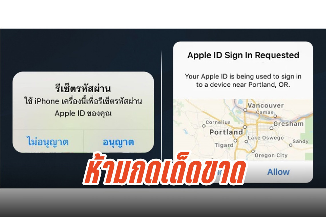 หรือ มีข้อความว่า “Apple ID Sign in Requested” มีการแจ้งว่ามีการเข้าระบบของ Apple โดยที่เราไม่ได้เข้าระบบ และมีการแสดงตำแหน่งแปลกๆ ที่เราไม่เคยไป หรืออยู่ต่างประเทศ