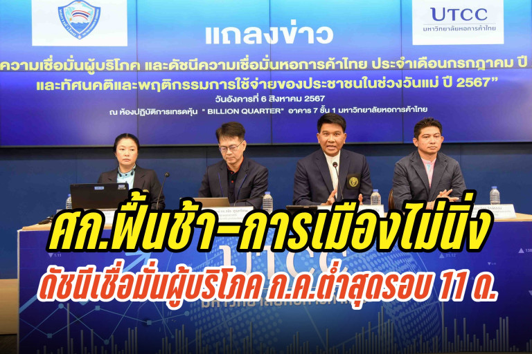 ศูนย์พยากรณ์เศรษฐกิจและธุรกิจ มหาวิทยาลัยหอการค้าไทย เปิดเผยว่า ดัชนีความเชื่อมั่นของผู้บริโภคในเดือน ก.ค.67 อยู่ที่ 57.7 ลดลงจาก 58.9 ในเดือน มิ.ย.67 โดยปรับตัวลงต่อเนื่องเป็นเดือนที่ 5 และอยู่ในระดับต่ำสุดในรอบ 11 เดือน นับตั้งแต่เดือน ก.ย.66 เป็นต้นมา เนื่องจากผู้บริโภคเริ่มกลับมากังวลว่าการเมืองไทยเริ่มขาดเสถียรภาพเกี่ยวกับการตัดสินของศาลรัฐธรรมนูญว่าจะตัดสินเรื่องการยุบพรรคก้าวไกล และความเป็นรัฐมนตรีของนายกรัฐมนตรีอย่างไร ส่งผลให้ผู้บริโภคเริ่มมีความกังวลเกี่ยวกับเสถียรภาพทางการเมืองในอนาคต และกังวลเกี่ยวกับภาวะเศรษฐกิจไทยที่ยังคงชะลอตัวลงและฟื้นตัวช้า เพราะยังไม่เห็นมาตรการกระตุ้นเศรษฐกิจที่ชัดเจน