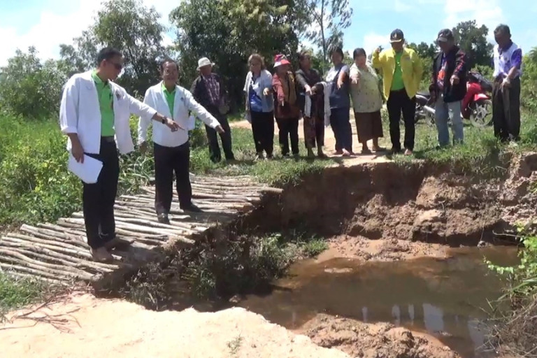 จุดที่ 2 ฝายกั้นน้ำลำห้วยแสง บ้านโคกล่าม ม.1 ต.โคกล่าม นายประถม ธราวุธ กล่าวว่า ก่อสร้างมาตั้งแต่ปี 2527 สภาพปัจจุบันประตูน้ำใช้งานไม่ได้ ไม่มีการบำรุงรักษา ไม่สามารถป้องกันและแก้ไขภัยแล้งได้ จึงอยากให้หน่วยงานที่เกี่ยวข้องมาปรับปรุงให้ใช้งานได้ดี ควบคุมน้ำได้เพื่อการเกษตรและการดำรงชีพของชาวบ้าน