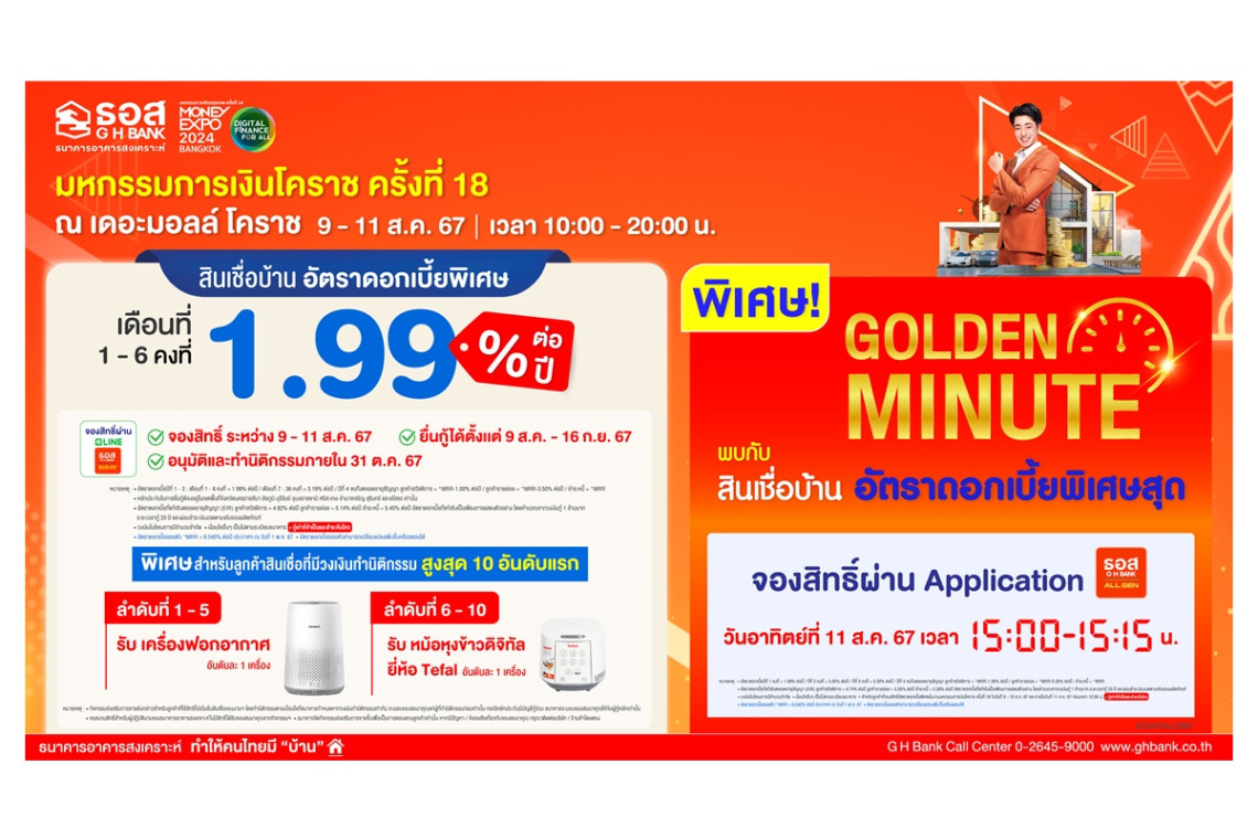 ธนาคารอาคารสงเคราะห์ (ธอส.) ในฐานะสถาบันการเงินของรัฐ ที่มีพันธกิจ “ทำให้คนไทยมีบ้าน” พร้อมสนับสนุนให้คนไทยมีที่อยู่อาศัยเป็นของตนเองมากขึ้น ด้วยการจัดโปรโมชันพิเศษร่วมงาน “มหกรรมการเงินโคราช ครั้งที่ 18 Money Expo 2024 Korat” ระหว่างวันที่ 9-11 สิงหาคม 2567 เพื่อเพิ่มโอกาสให้พี่น้องชาวอีสาน ได้เข้าถึงผลิตภัณฑ์ทางการเงินของธนาคาร นำโดย (1) สินเชื่อบ้านอัตราดอกเบี้ยพิเศษ อัตราดอกเบี้ยเดือนที่ 1 - 6 เท่ากับ 1.99% ต่อปี,เดือนที่ 7 - 36 เท่ากับ 3.19% ต่อปี (อัตราดอกเบี้ยเฉลี่ย 3 ปีแรกเท่ากับ 2.99% เท่านั้น) และปีที่ 4 จนถึงตลอดอายุสัญญา กรณีลูกค้าสวัสดิการ เท่ากับ MRR-1.00% ต่อปี, ลูกค้ารายย่อย เท่ากับ MRR-0.50% ต่อปี และการกู้ชำระหนี้เกี่ยวกับที่อยู่อาศัย เท่ากับ MRR (อัตราดอกเบี้ย MRR ธอส. ปัจจุบัน เท่ากับ 6.545% ต่อปี) ผ่อนชำระนานสูงสุดถึง 40 ปี ให้กู้ครอบคลุมทุกวัตถุประสงค์หลัก อาทิ ซื้อบ้าน/คอนโดมิเนียม ปลูกสร้าง ต่อเติม ซ่อมแซม รีไฟแนนซ์ และชำระหนี้เกี่ยวกับที่อยู่อาศัย (หลักประกันในการยื่นกู้ต้องอยู่ในเขตพื้นที่จังหวัดนครราชสีมา ชัยภูมิ บุรีรัมย์ อุบลราชธานี ศรีสะเกษ อำนาจเจริญ สุรินทร์ และยโสธร เท่านั้น) โดยสามารถจองสิทธิ์ผ่าน Line GHB Buddy ยื่นคำขอกู้ได้ตั้งแต่วันที่ 9 สิงหาคม – 16 กันยายน 2567 และทำนิติกรรมภายในวันที่ 31 ตุลาคม 2567 โดยผู้กู้จะได้รับสิทธิ์ค่าประเมินราคาหลักประกันอัตราพิเศษอีกด้วย และพิเศษสุดสำหรับลูกค้าภายในงานเท่านั้น!! ช่วง Golden Minute อัตราดอกเบี้ยต่ำ โดยเปิดจองสิทธิ์ผ่าน Mobile Application : GHB ALL GEN ในวันอาทิตย์ที่ 11 สิงหาคม 2567 ระหว่างเวลา 15.00 - 15.15 น. จองก่อนได้ก่อน กรอบวงเงินจำกัดและเงื่อนไขตามที่ธนาคารกำหนด พิเศษ! สำหรับลูกค้าที่มีวงเงินทำนิติกรรมสูงสุด 10 อันดับแรก รับของสมนาคุณฟรีมากมาย!! โดยลำดับที่ 1 - 5 รับเครื่องฟอกอากาศ 1 เครื่อง (อันดับละ 1 สิทธิ์), ลำดับที่ 6 - 10 รับหม้อหุงข้าวดิจิทัล ยี่ห้อ Tefal จำนวน 1 เครื่อง (อันดับละ 1 สิทธิ์)