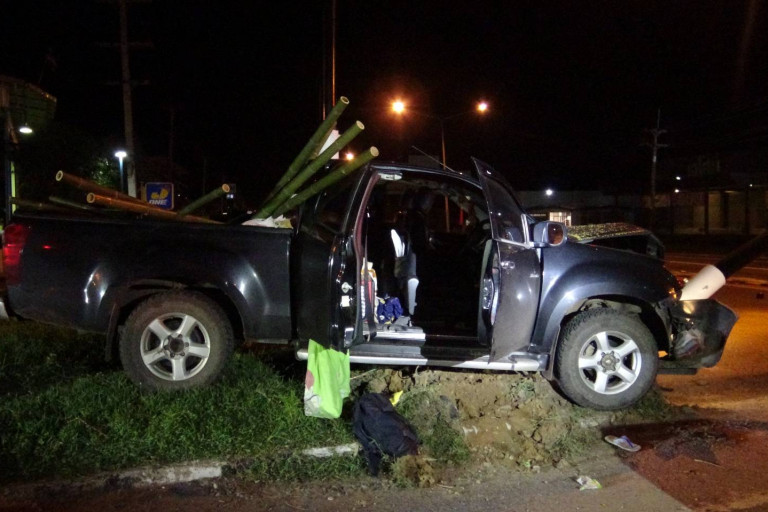 "ยโสธร" คนขับหลับในกระบะพุ่งชนเสาไฟสัญญาณจราจร
