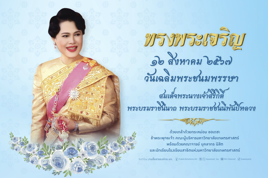 ชาวมหาวิทยาลัยเกษตรศาสตร์ รวมพลังแสดงความจงรักภักดี และน้อมสำนึกในพระมหากรุณาธิคุณ สมเด็จพระนางเจ้าสิริกิติ์ พระบรมราชินีนาถ พระบรมราชชนนีพันปีหลวง จัดพิธีถวายพระพรชัยมงคล เนื่องในโอกาสเฉลิมพระชนมพรรษา 92 พรรษา 12 สิงหาคม 2565 ในวันศุกร์ที่ 9 สิงหาคม พ.ศ.2567 เวลา 9.00 น. ณ ห้องประชุมสุธรรม อารีกุล ชั้น 1 อาคารสารนิเทศ 50 ปี มหาวิทยาลัยเกษตรศาสตร์ พร้อมเชิญชวนบุคลากร นิสิตปัจจุบัน นิสิตเก่า นักเรียน และ ประชาชน ร่วมถวายพระพรชัยมงคล ผ่านระบบออนไลน์ https://kuform.ku.ac.th/12aug2567 ตั้งแต่วันที่ 8 – 13 สิงหาคม 2567