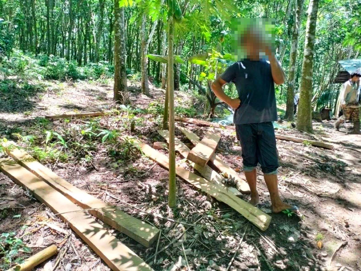 ต่อมาวันที่ 11 ส.ค.67 นายสมเจตน์ จันทนา ผู้อำนวยการสำนักบริหารพื้นที่อนุรักษ์ที่ 3 (สบอ.3) สาขาเพชรบุรี ได้รับรายงานจากนายกิตติศักดิ์ สมศรี นักวิชาการป่าไม้ชำนาญการ หัวหน้าเขตรักษาพันธุ์สัตว์ป่า อุทยาน เสด็จในกรม กรมหลวงชุมพร ด้านทิศเหนือ (ตอนบน) จ.ประจวบฯ ขณะเจ้าหน้าที่อุทยานฯ ออกลาดตระเวนเพื่อปราบปรามการกระทำผิดกฎหมายเกี่ยวกับการป่าไม้ภายในพื้นที่รับผิดชอบอย่างต่อเนื่องมาถึงบริเวณป่าตะบองยักษ์ ท้องที่บ้านเขาแก้ว หมู่ที่ 6 ต.ทองมงคล อ.บางสะพาน พิกัดที่ 47 P 0536597 E 1240719 N พบไม้แปรรูป จำนวน 3 แผ่น วางกองอยู่ จึงได้กระจายกำลังตรวจสอบพบร่องรอยการลากไม้ไปตามเส้นทางลำลองจึงเดินตามไปจนพบขนำลักษณะเพิ่งก่อสร้างโดยใช้ไม้แผ่นแปรรูปเป็นส่วนประกอบ จำนวน 1 หลัง ภายในสวนยางพารา ก่อนพบชาย 1 คน ยืนอยู่และรับว่าเป็นเจ้าของขนำและเจ้าของพื้นที่ดังกล่าว ตรวจสอบพบไม้แปรรูปจำนวนมากวางกองข้างขนำ รวมทั้งสิ้น 61 แผ่น จึงยึดไว้เป็นหลักฐาน นอกจากนั้นยังพบมีการบุกรุกแผ้วถางขยายพื้นที่ทำกินเพื่อปลูกทุเรียน คิดเป็นพื้นที่บุกรุก จำนวน 1 - 2 - 96 ไร่