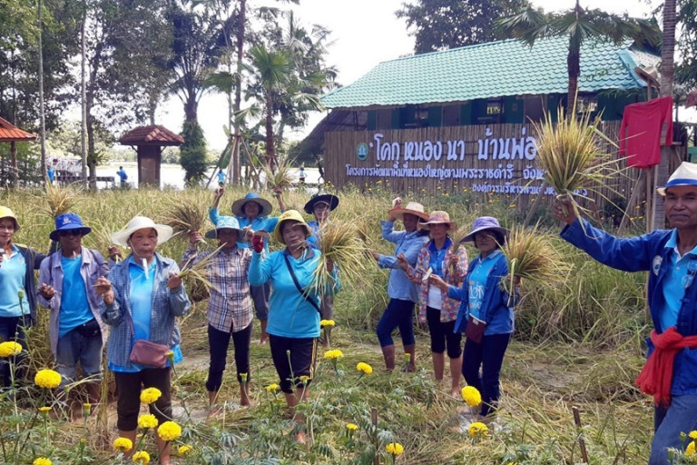 โดยตำบลสองพี่น้อง ได้ปลูกไว้เป็นเวลา 110 วันแล้ว จึงได้ร่วมกันเก็บเกี่ยวในวันแม่แห่งชาติ ซึ่งการเก็บเกี่ยวนั้น ได้ใช้อุปกรณ์ที่เรียกว่าแกะ ไม่ได้ใช้เคียวเกี่ยวข้าวเหมือนทั่วไป ใช้วิธีเก็บทีละรวง .ซึ่งนาแปลงนี้จะปลูกหมุนเวียนตลอดทั้งปี เพื่อให้นักท่องเที่ยวได้เดินทางมาถ่ายภาพ มาศึกษาวิธีการทำนา ซึ่งข้าวที่ปลูกในแปลงนานี้ เป็นข้าวกข 43 ซึ่งเป็นพันธุ์ข้าวพระราชทานจากสมเด็จพระกนิษฐาธิราชเจ้า กรมสมเด็จพระเทพรัตนราชสุดา ฯ สยามบรมราชกุมารี