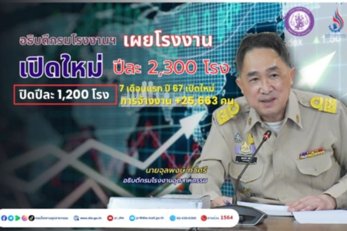 อธิบดีกรมโรงงานฯ เผย 7 เดือนแรกปี 67 โรงงานเปิดใหม่เพิ่มมากกว่าเลิกกิจการ-จ้างงานพุ่ง 25,663 คน