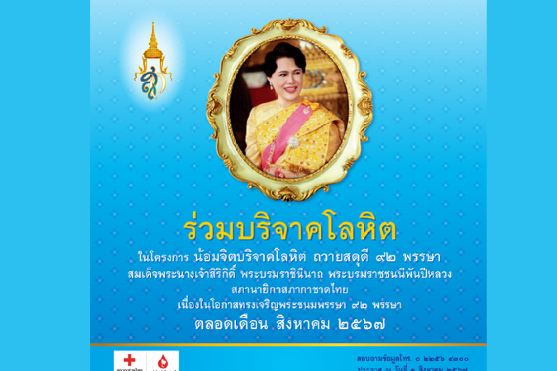 ด้วยสำนึกในพระมหากรุณาธิคุณอย่างหาที่สุดมิได้ ศูนย์บริการโลหิตแห่งชาติ ขอเชิญพสกนิกรทุกหมู่เหล่าร่วมแสดงความจงรักภักดี น้อมจิตบริจาคโลหิต ถวายสดุดี 92 พรรษา สมเด็จพระนางเจ้าสิริกิติ์ พระบรมราชินีนาถ พระบรมราชชนนีพันปีหลวง สภานายิกาสภากาชาดไทย เนื่องในโอกาสทรงเจริญพระชนมพรรษา 92 พรรษา ตลอดเดือนสิงหาคม 2567 ได้ที่