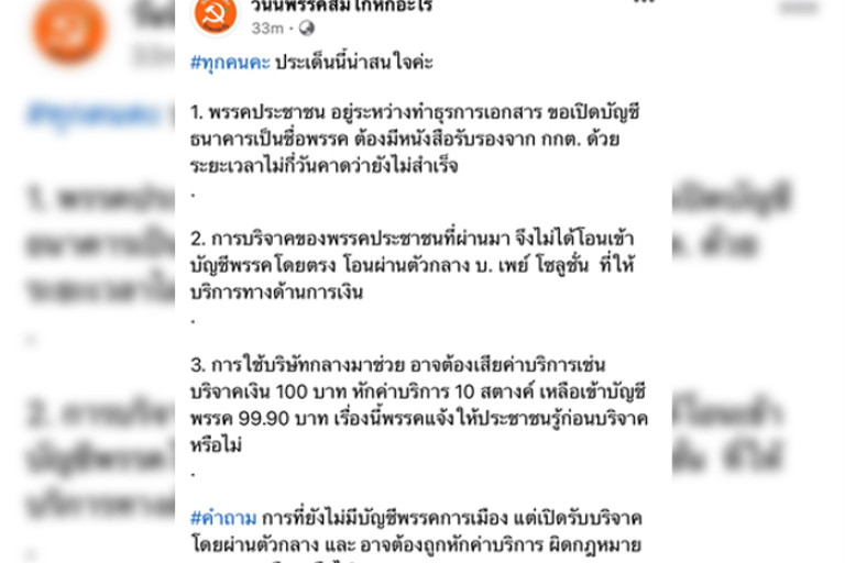 “เพจวันนี้พรรคส้มโกหกอะไร” จับผิดพรรคประชาชน เปิดรับบริจาคเงินเข้าบัญชีคนกลางพรรคยังรับรองเปิดบัญชีไม่ได้ แต่รับบริจาคผิดกฎหมายหรือไม่
