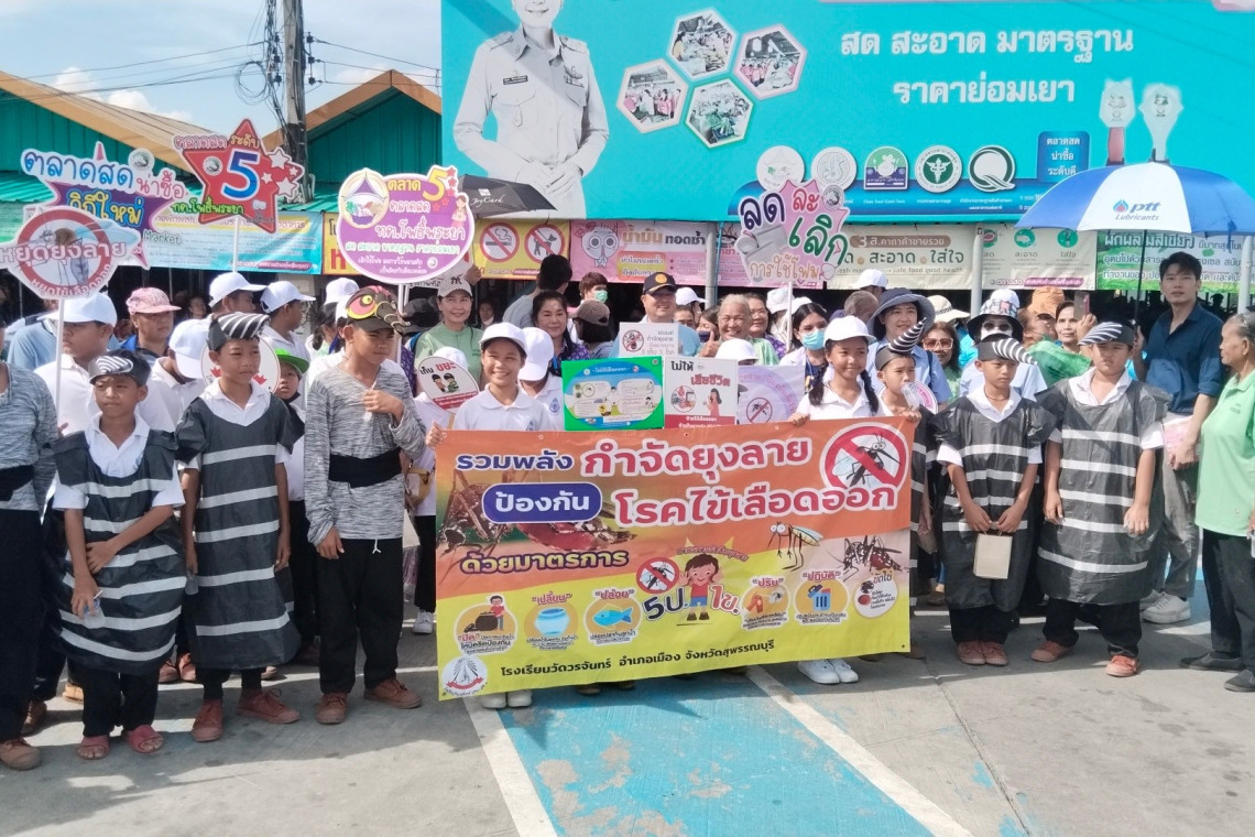 พร้อมกับได้เดินถือป้ายรณรงค์ การป้องกันและควบคุมโรคไข้เลือดออก ที่ตลาดโพธิ์พระยา อำเมืองสุพรรณบุรี เพื่อประชาสัมพันธ์ ให้พ่อค้า แม่ค้า และประชาชน ที่มาจับจ่ายซื้อของในตลอดโพธิ์พระยา ได้ช่วยกันป้องกันและควบคุมโรคไข้เลือดออก พร้อมกับร่วมกันปล่อยพันธุ์ปลาลงในแม่ท่าจีน