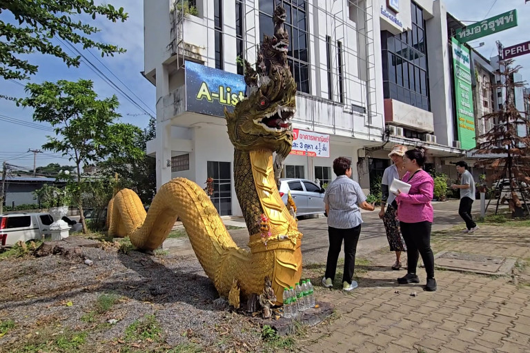 โดยได้พบกับนางนิตยา แก้วมาย์ อายุ 70 ปี เจ้าของอาคารพาณิชย์ดังกล่าว ซึ่งได้พาผู้สื่อข่าวเดินดูพญานาคตั้งอยู่บริเวณที่ดินเปล่าข้างอาคาร พบพญานาคยาวประมาณ 10 เมตร ทาสีทอง อร่ามทั้งตัว ส่วนที่เศียรพบว่าเศียรเล็กหัก และมีชวดน้ำพร้อมพวงมาลัยที่มีคนนำมาสักการะบูชา