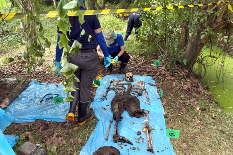 โดยเจ้าหน้าที่ทีมตรวจ (CSI) ของสถาบันนิติวิทยาศาสตร์ ได้รวบรวมโครงกระดูกมนุษย์มาวางเรียง โดยได้ชิ้นส่วนมาเกือบครบชิ้นส่วนของกระดูกไม่พบร่องรอยของการตัดแต่อย่างใด นอกจากนี้ใกล้กันยังพบกางเกงขาสั้น 3 ส่วน ในกระเป๋ากางเกงข้างหลังด้านขวา พบเอกสารใบอนุญาตทำงานของคนต่างด้าวมีชื่อผู้สมัครงาน คือ นายมิน ออง ทาน อู อายุ 42 ปี สัญชาติ เมียนมา อยู่ ม.3 แขวงคลองสิบ เขตหนองจอก จ.กรุงเทพ และบัตรชมพูแรงงานต่างด้าว ใกล้เคียง พบรองเท้าแตะสีดำ 1 คู่ ส่วนเชือกมีการผูกปมคล้องไว้กับต้นมะม่วงโดยใช้ลวดไม้แขวนเสื้อมาเกี่ยวคล้องกับเชือก โดยเจ้าหน้าที่ได้ทำการถ่ายภาพเก็บหลักฐานก่อนนำนำโครงกระดูกที่ตรวจพบทั้งหมดขึ้นรถเพื่อส่งต่อให้กับผู้เชี่ยวชาญที่สถาบันนิติวิทยาศาสตร์ตรวจสอบอย่างละเอียดอีกครั้ง จากการตรวจสอบเบื้องต้นคาดผู้เสียชีวิต เสียชีวิตมาไม่ต่ำกว่า 1-2 เดือน