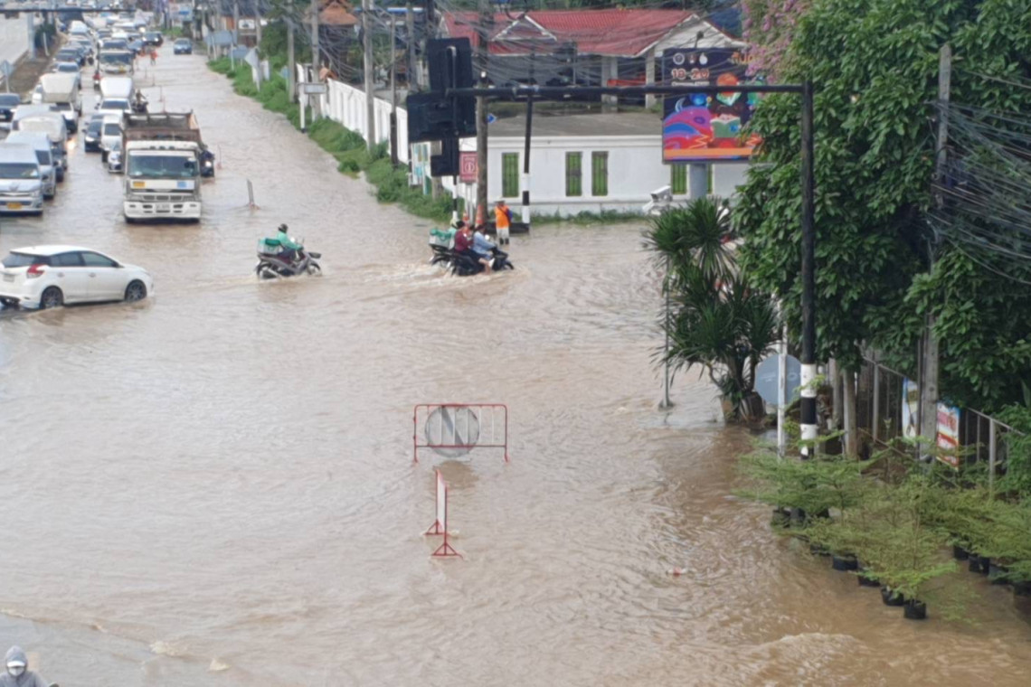 วันที่ 15 ส.ค.2567 ผู้สื่อข่าวรายงานว่าหลังจากมีฝนตกลงมาอย่างหนักได้ทำให้น้ำจากเทือกเขาดอยโป่งพระบาท ได้ไหลบ่าไปเอ่อล้นอยู่บริเวณถนนพหลโยธินตรงทางเข้ามหาวิทยาลัยราชภัฏเชียงราย ต.บ้านดู่ อ.เมืองเชียงราย จ.เชียงราย โดยน้ำไม่สามารถระบายผ่านถนนได้อย่างรวดเร็วทำให้ถนน 4 ช่องจราจรฝั่งมหาวิทยาลัยมีระดับลึกประมาณ 20-30 ซ.ม.และต่อมาระดับน้ำได้เพิ่มสูงขึ้นทำให้รถสามารถสัญจรผ่านไปมาใน 2 ช่องจราจรฝั่งขาขึ้นได้เพียงช่องทางเดียว ส่งผลทำให้มีรถติดยาวไปจนถึงเกือบตลาดสดบ้านดู่ระยะทางประมาณ 1 กิโลเมตร