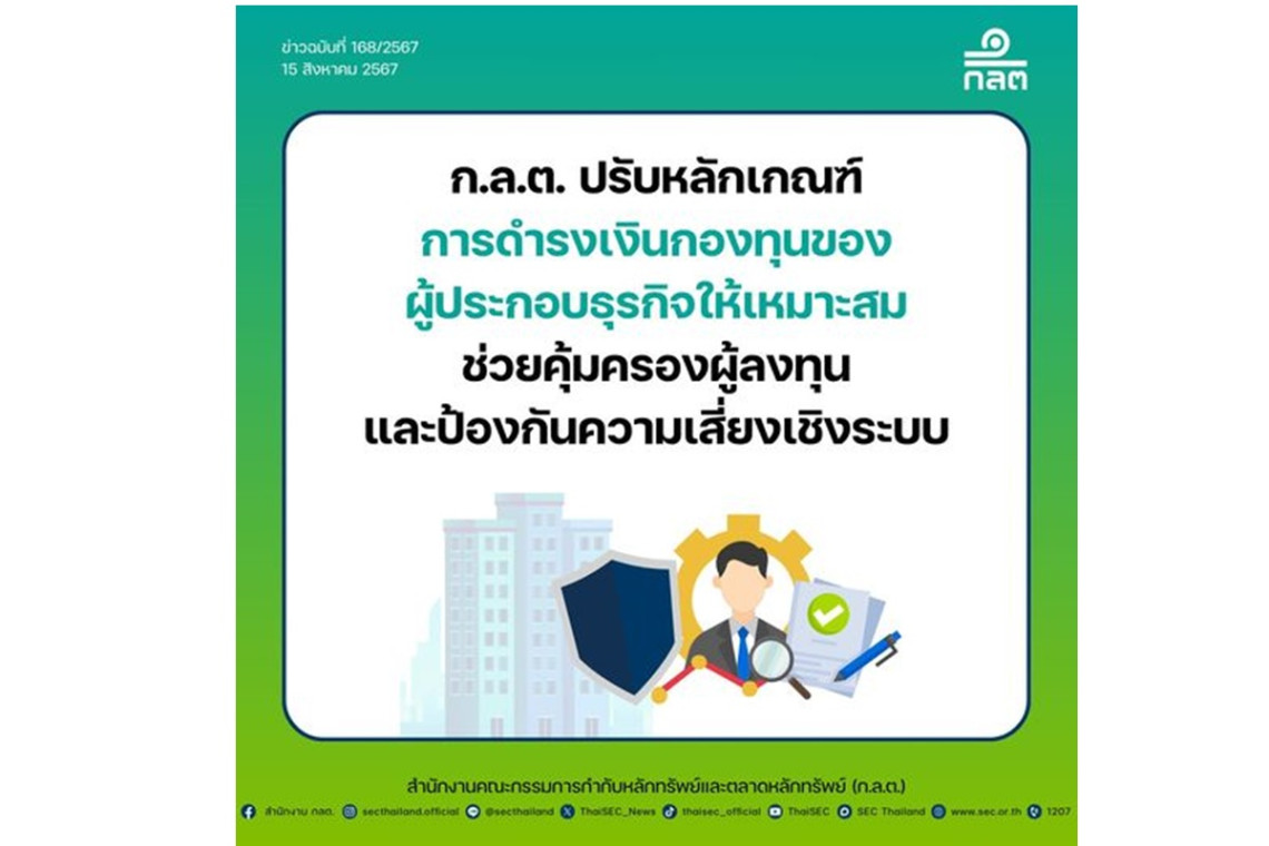 สำนักงานคณะกรรมการกำกับหลักทรัพย์และตลาดหลักทรัพย์ (ก.ล.ต.) รายงานว่า ก.ล.ต.ได้ปรับปรุงหลักเกณฑ์การดำรงเงินกองทุนของผู้ประกอบธุรกิจหลักทรัพย์และผู้ประกอบธุรกิจสัญญาซื้อขายล่วงหน้า เพื่อให้ผู้ประกอบธุรกิจมีเงินกองทุนเพียงพอรองรับความเสี่ยงจากการประกอบธุรกิจและสามารถประกอบธุรกิจได้อย่างต่อเนื่อง ซึ่งเป็นการคุ้มครองผู้ลงทุนและป้องกันความเสี่ยงเชิงระบบ (systemic risk) รวมทั้งช่วยเพิ่มความยืดหยุ่นและไม่สร้างภาระเกินจำเป็นแก่ผู้ประกอบธุรกิจ