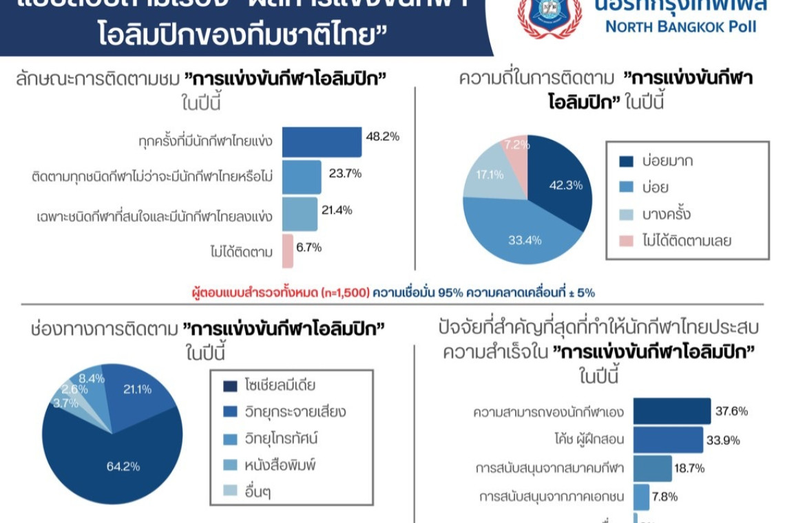 วันที่ 16 ส.ค.2567 ผศ.ดร.สานิต ศิริวิศิษฐ์กุล ศูนย์สำรวจความคิดเห็น นอร์ทกรุงเทพโพล เปิดเผยว่า จากการสำรวจความคิดเห็นของประชาชน ระหว่างวันที่ 11 – 13 สิงหาคม 2567 จากจำนวน 1,500 ตัวอย่าง จากทุกภูมิภาคทั่วประเทศในประเด็นผลกีการแข่งขันกีฬาโอลิมปิกทีมชาติไทยพบว่า ลักษณะการติดตามชมการแข่งขันกีฬาโอลิมปิกในครั้งนี้พบว่า มีการติดตามทุกครั้งที่มีนักกีฬาไทยแข่งร้อยละ 48.2 ติดตามทุกชนิดกีฬาไม่ว่าจะมีนักกีฬาไทยลงแข่งหรือไม่ ร้อยละ 23.7 ติดตามเฉพาะชนิดกีฬาที่สนใจและมีนักกีฬาไทยลงแข่ง ร้อยละ 21.4 และไม่ได้ติดตาม ร้อยละ 6.7 ความถี่ในการติดตามพบว่า ติดตามชมบ่อยมาก ร้อยละ 42.3 ติดตามบ่อย ร้อยละ 33.4 ติดตามบางครั้ง ร้อยละ 17.1 และไม่ได้ติดตามเลย ร้อยละ 7.2 ช่องทางการติดตาม พบว่าติดตามข่าวการแข่งขันกีฬาโอลิมปิกในช่องทาง โชเชียลมีเดีย ร้อยละ 64.2วิทยุกระจายเสียง ร้อยละ 21.1 วิทยุโทรทัศน์ ร้อยละ 8.4หนังสือพิมพ์ ร้อยละ 3.7 และ อื่น ๆเช่นพูดคุยกับเพื่อนร่วมงาน ร้อยละ 2.6