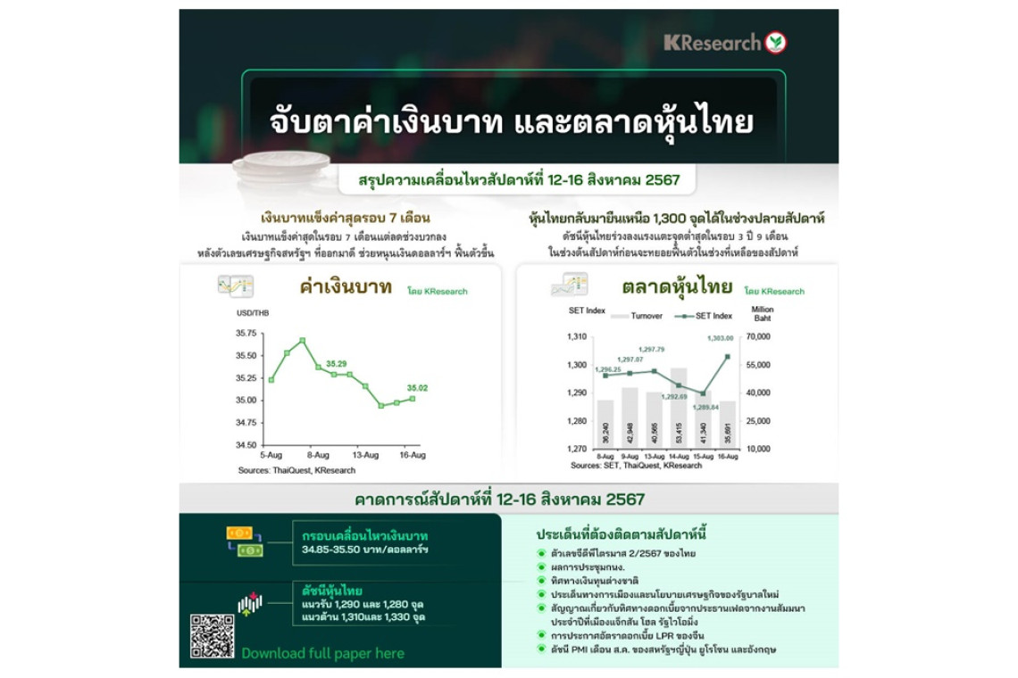 สัปดาห์ระหว่างวันที่ 19-23 ส.ค. 2567 KBank คาดกรอบการเคลื่อนไหวของเงินบาทที่ 34.85-35.50 บาทต่อดอลลาร์ฯ ปัจจัยที่ต้องติดตาม ได้แก่ ตัวเลขจีดีพีไตรมาส 2/2567 ของไทย ผลการประชุมกนง. ทิศทางเงินทุนต่างชาติ ประเด็นทางการเมืองและนโยบายเศรษฐกิจของรัฐบาลใหม่ สัญญาณเกี่ยวกับทิศทางดอกเบี้ยจากประธานเฟดจากงานสัมมนาประจำปีที่เมืองแจ็กสัน โฮล รัฐไวโอมิ่ง บันทึกการประชุมเฟดเมื่อวันที่ 30-31 ก.ค. การประกาศอัตราดอกเบี้ย LPR ของจีน ตลอดจนดัชนี PMI ภาคการผลิตและภาคบริการ (เบื้องต้น) เดือนส.ค. ของญี่ปุ่น ยูโรโซน อังกฤษ และสหรัฐฯ