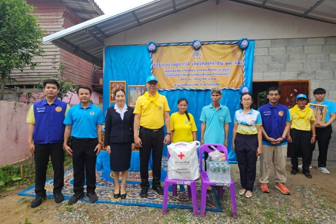 ในการนี้ได้รับความเมตตาจากท่านพระครูไพรบูลย์ ชัยสิทธิ เจ้าคณะอำเภอศรีสัชนาลัย และคณะสงฆ์ ได้เจิมบ้านและปะพรมน้ำมนต์ ให้แก่เจ้าของบ้านและผู้ที่มาร่วมพิธีฯ นอกจากนี้นายอำเภอศรีสัชนาลัย นายกกิ่งกาชาดอำเภอศรีสัชนาลัย และแขกผู้มีเกียรติได้ร่วมมอบ พระบรมฉายาลักษณ์พระบาทสมเด็จพระเจ้าอยู่หัว พระฉายาลักษณ์ สมเด็จพระนางเจ้าฯ พระบรมราชชินี พระฉายาลักษณ์พระบาทสมเด็จพระบรมชนกาธิเบศร มหาภูมิพลอดุลยเดชมหาราช บรมนาถบพิตร และพระฉายาลักษณ์สมเด็จพระนางเจ้าสิริกิต์ พระบรมราชินีนาถ พระบรมราชชนนีพันปีหลวง พร้อมถุงยังชีพ และเงินช่วยเหลือจำนวนหนึ่ง ให้แก่ผู้ยากไร้รายดังกล่าว