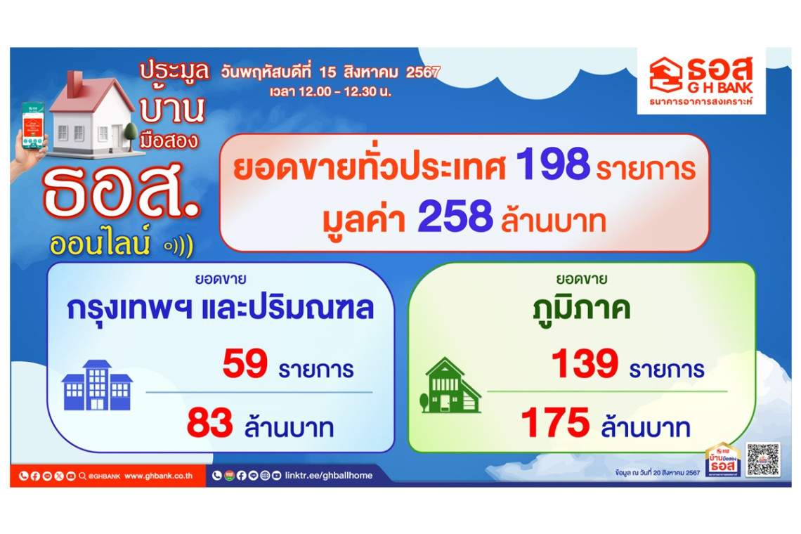 ธนาคารอาคารสงเคราะห์ (ธอส.) เปิดเผยผลการจัดงาน “ประมูลบ้านมือสองออนไลน์ : GHB’S NPA Online Auction 2024” ประจำเดือนสิงหาคม 2567 ซึ่งจัดขึ้นพร้อมกันทั่วประเทศ ผ่าน Application : GHB ALL HOME เมื่อวันพฤหัสบดีที่ 15 สิงหาคม 2567 และเนื่องจากมีประชาชนให้ความสนใจจำนวนมาก ทำให้ธนาคารต้องขยายระยะเวลาการประมูลออกไป ระหว่างเวลา 12.00 - 14.00 น. โดยสามารถจำหน่ายบ้านมือสองได้จำนวน 198 รายการ คิดเป็นมูลค่า 258 ล้านบาท แบ่งเป็น ทรัพย์ที่ตั้งอยู่ในพื้นที่กรุงเทพฯ และปริมณฑล จำนวน 59 รายการ มูลค่ารวม 83 ล้านบาท และในส่วนภูมิภาค 139 รายการ มูลค่ารวม 175 ล้านบาท