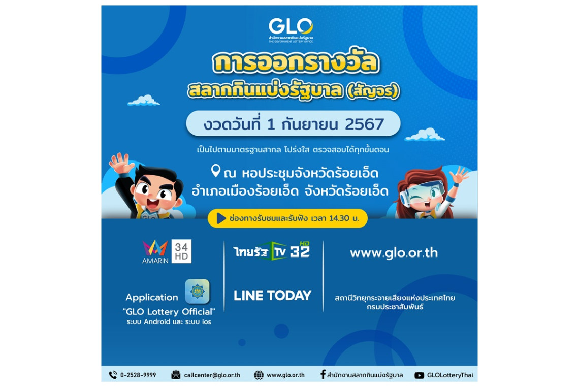 พันโท หนุน ศันสนาคม ผู้อำนวยการสำนักงานสลากกินแบ่งรัฐบาล (GLO) เปิดเผยว่า การออกรางวัลสลากกินแบ่งรัฐบาล งวดวันที่ 1 กันยายน 2567 นี้ สำนักงานฯ จะเดินทางไปออกรางวัลสลากสัญจร ณ หอประชุมจังหวัดร้อยเอ็ด อำเภอเมืองร้อยเอ็ด จังหวัดร้อยเอ็ด เพื่อเปิดโอกาสให้ประชาชนในต่างจังหวัดได้เห็นขั้นตอนและวิธีการ ตลอดจนอุปกรณ์ที่ใช้ในการออกรางวัลด้วยตนเอง จะได้ไม่หลงเชื่อข่าวลือเรื่องเลขเด็ดจากกลุ่มมิจฉาชีพที่ทำการหลอกลวงต้มตุ๋น ผ่านทางสื่อสังคมออนไลน์ และการส่งจดหมายแอบอ้างว่าสามารถให้ตัวเลขที่จะออกรางวัลได้
